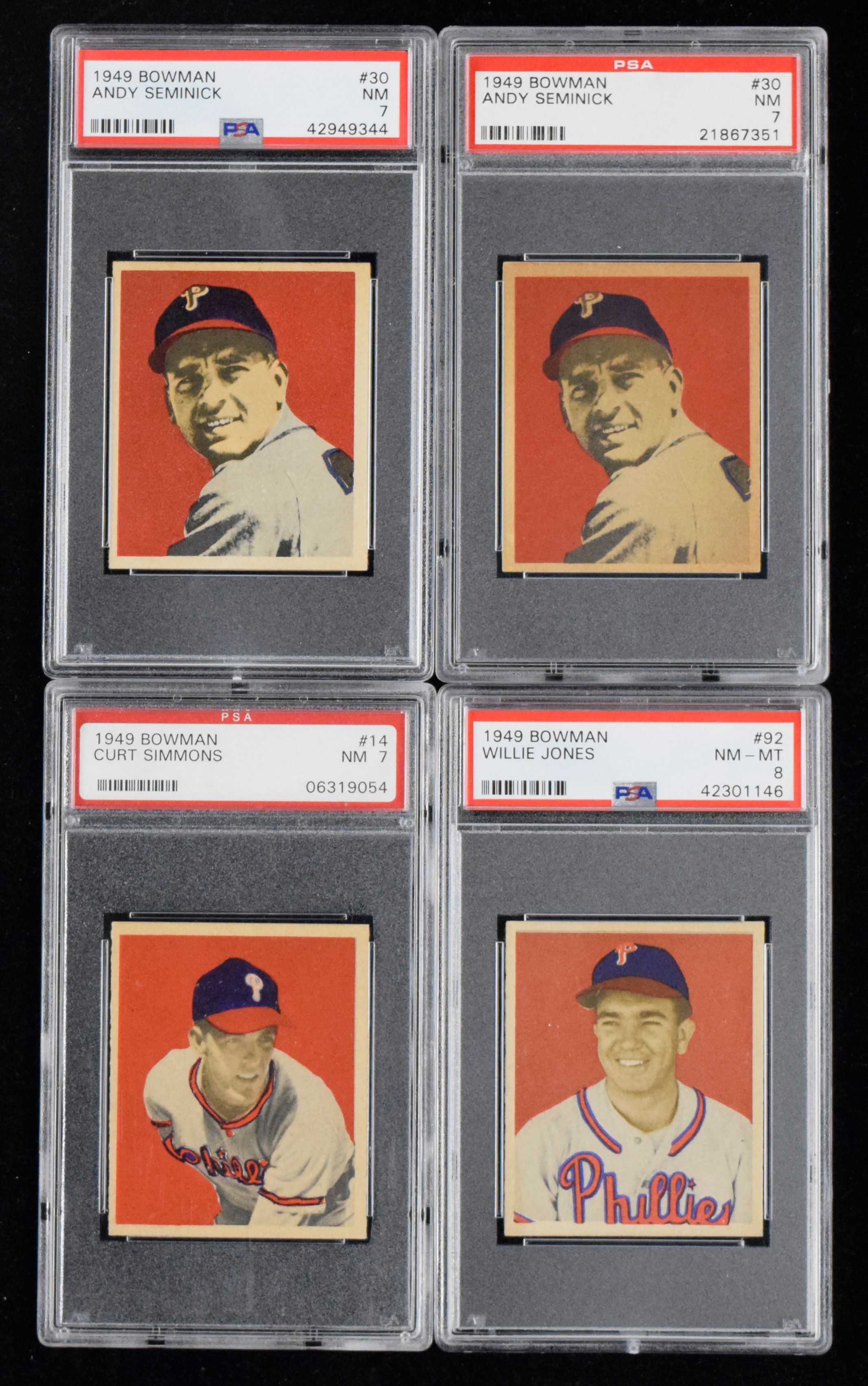 Lot of (4) high-grade 1949 Bowman Phillies, including Simmons and Jones (PSA 7 NM - PSA 8 NM/MT). Outstanding lot of PSA-graded 1949 Bowman Phillies cards, with (3) graded PSA 7 NM: #s 14 Curt Simmons and (2) 30 Andy Seminick and (1) PSA 8 NM/MT: #92 Willie Jones. Range: PSA 7 NM - PSA 8 NM/MT.