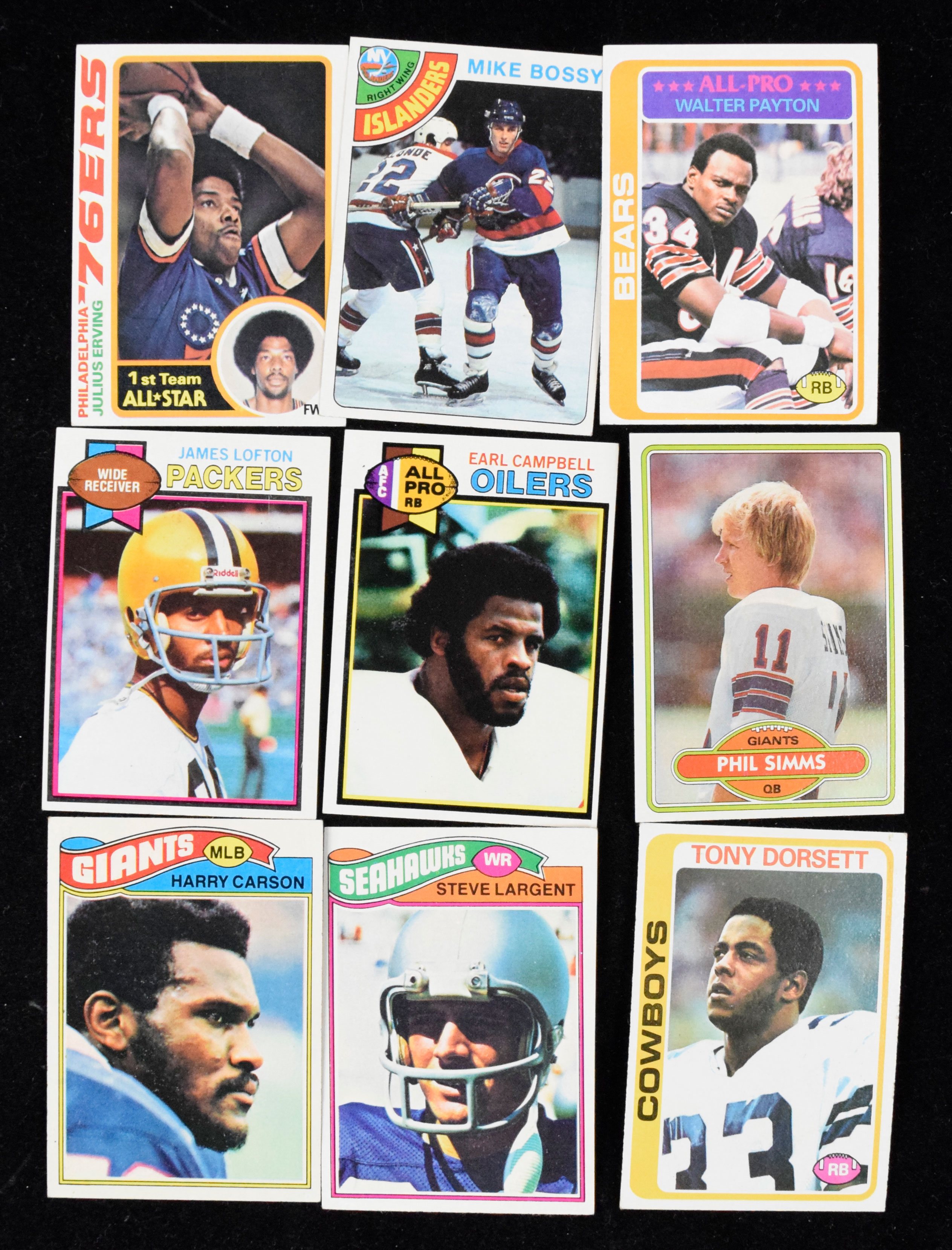 Description:1977, 78, 79, and 80 Topps Football complete sets plus 1978-79 Basketball and Hockey (VG-NM) Run of (4) complete football sets in EX-NM condition with a small portion lesser (including some of the keys cards from earlier sets which have a touch to corners and/or other minute flaw) and there are many NM and some better cards mixed (including some keys from later years). Also includes complete 1978-79 Topps Basketball and Hockey sets in similar range of condition: VG-NM ($400-$600)