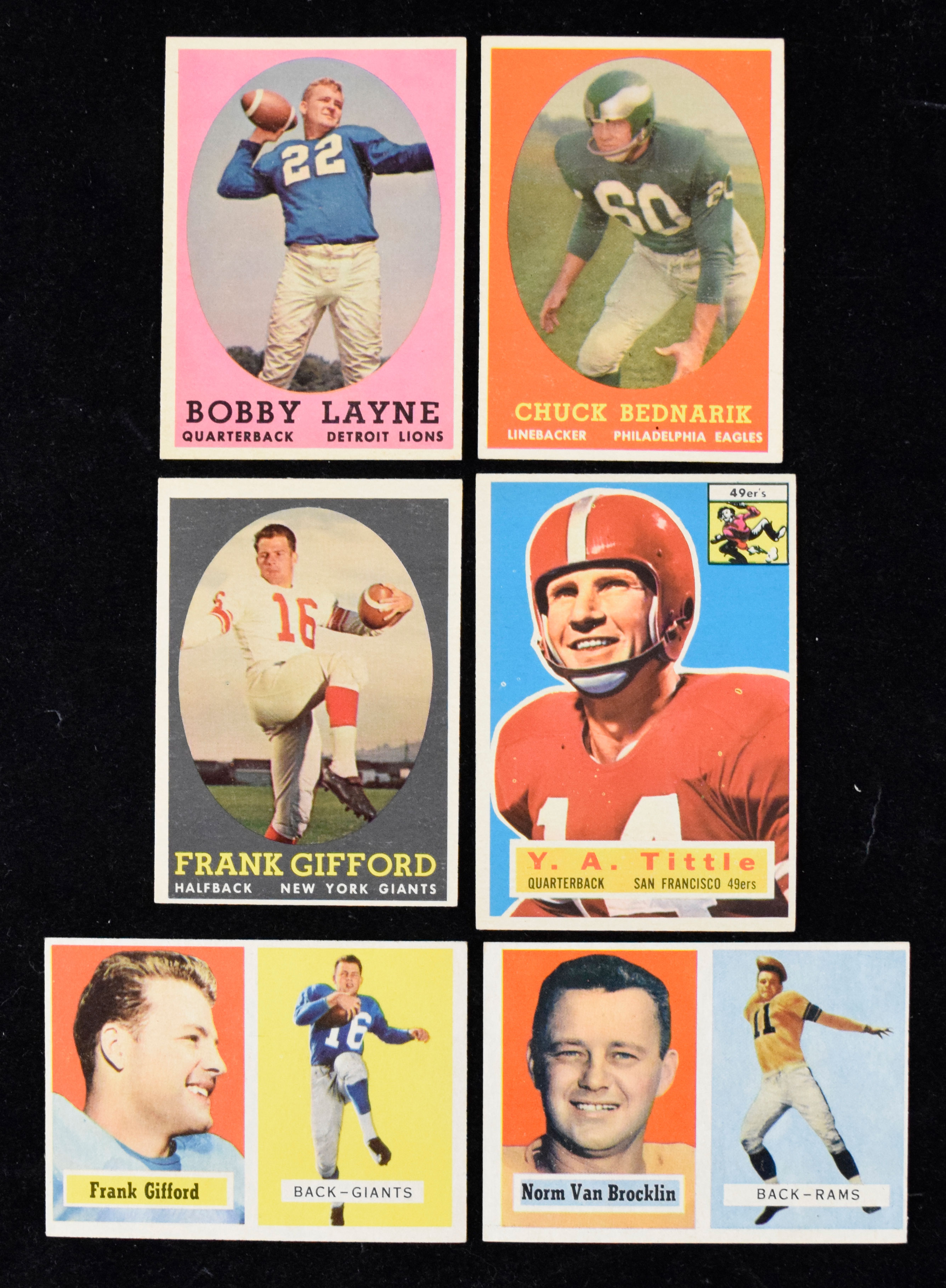 Description:Lot of (29) 1958-1958 Topps FB cards with many HOFers, including Gifford, Tittle (PR-EX/MT). Nice assortment of mostly NFL stars and Hall of Famers spanning 1956 through 1958 Topps. Includes (1) 1956: 86 Y.A. Tittle; (9) 1957, highlighted by #s 22 Norm Van Brocklin, 49 Chuck Bednarik, 53 Alan Ameche, 14 Pat Summerall, 59 Kyle Rote, 26 Ollie Matson, 5 Gino Marchettie, 32 Bobby Layne and 88 Frank Gifford; and (23) 1958 Topps, highlighted by #s 12 Alan Ameche, 35 Chuck Bednarik, 52, Lou Groza, 73 Frank Gifford, 2 Bobby Layne, 10 Lenny Moore, 126 Tommy McDonald and (9) team cards. Most cards appear EX-EX/MT with a couple less (57 Marchetti and Rote have heavy creases). Range: PR-EX/MT.