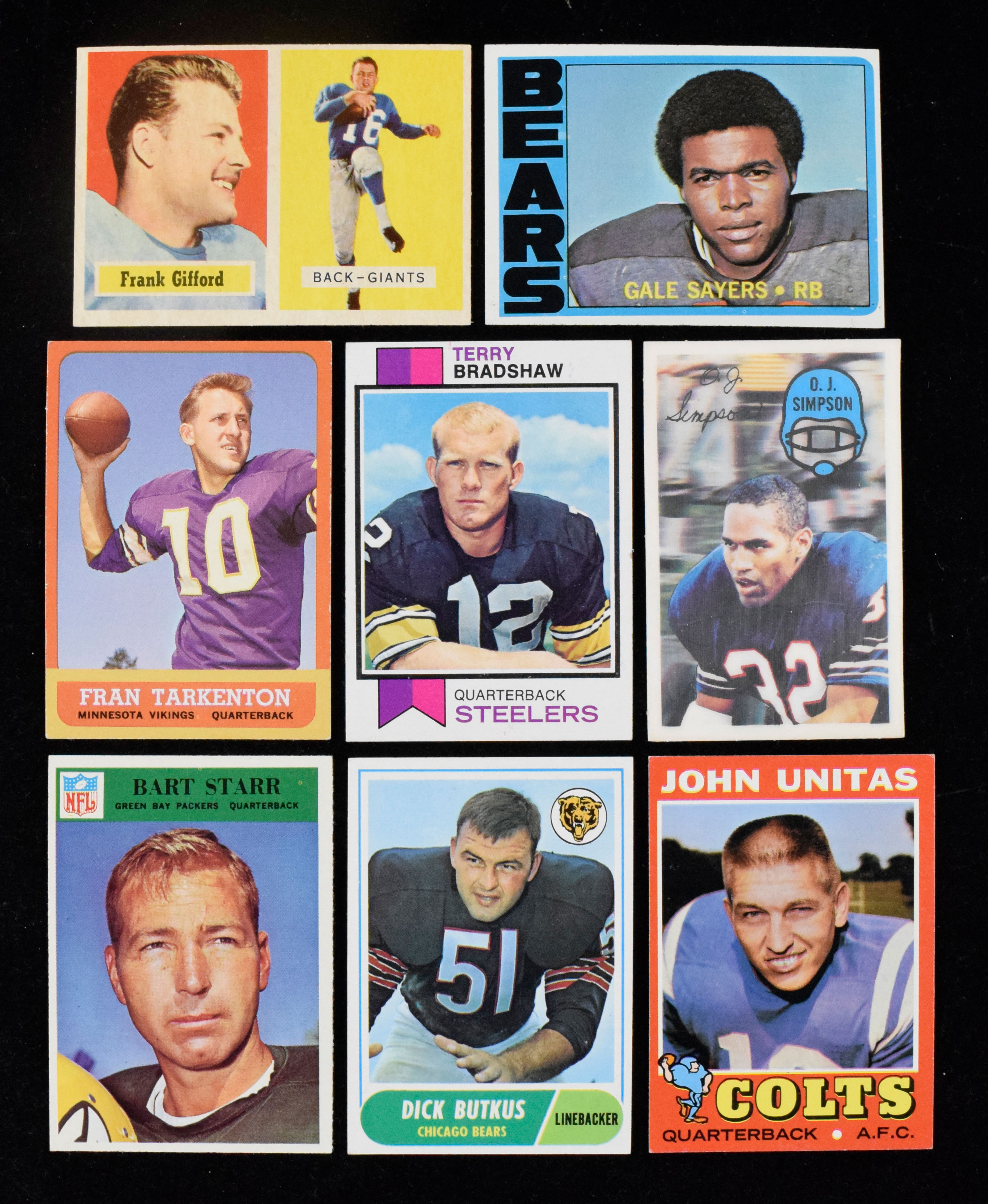 Description:Small binder of (65) 1957-1972 football cards with many HOFers, including Tarkenton, Sayers (VG/EX-MT). Small binder spans 1957 through 1972 Topps, Kellogg's, Philadelphia and Fleer, and is chock full of NFL stars and Hall of Famers. Highlights include 1963 Topps #98 Fran Tarkenton and #107 Jim Marshall RC; 1966 Topps # 95 Don Maynard; 1966 Philadelphia #88 Bart Starr; 1968 Topps #s 88 Sonny Jurgensen, 127 Dick Butkus, 149 Jack Kemp and 171 Len Dawson; 1957 Topps #88 Frank Gifford; 1958 Topps #35 Chuck Bednarik; 1970 Topps #s 180 Johnny Unitas, 114 Bubba Smith RC and 260 Calvin Hill RC; 1974 Topps #500 Roger Staubach; 1971 Topps #s 1 Johnny Unitas and 150 Gale Sayers; 1972 Topps #s 55 Archie Manning RC and 110 Gale Sayers; 1973 Topps #15 Terry Bradshaw; 1970 Kellogg's #s 48 O.J. Simpson, 51 Gale Sayers, 55 Johnny Unitas and others. Most appear EX-NM, with some better and some worse. Range: VG/EX-MT.