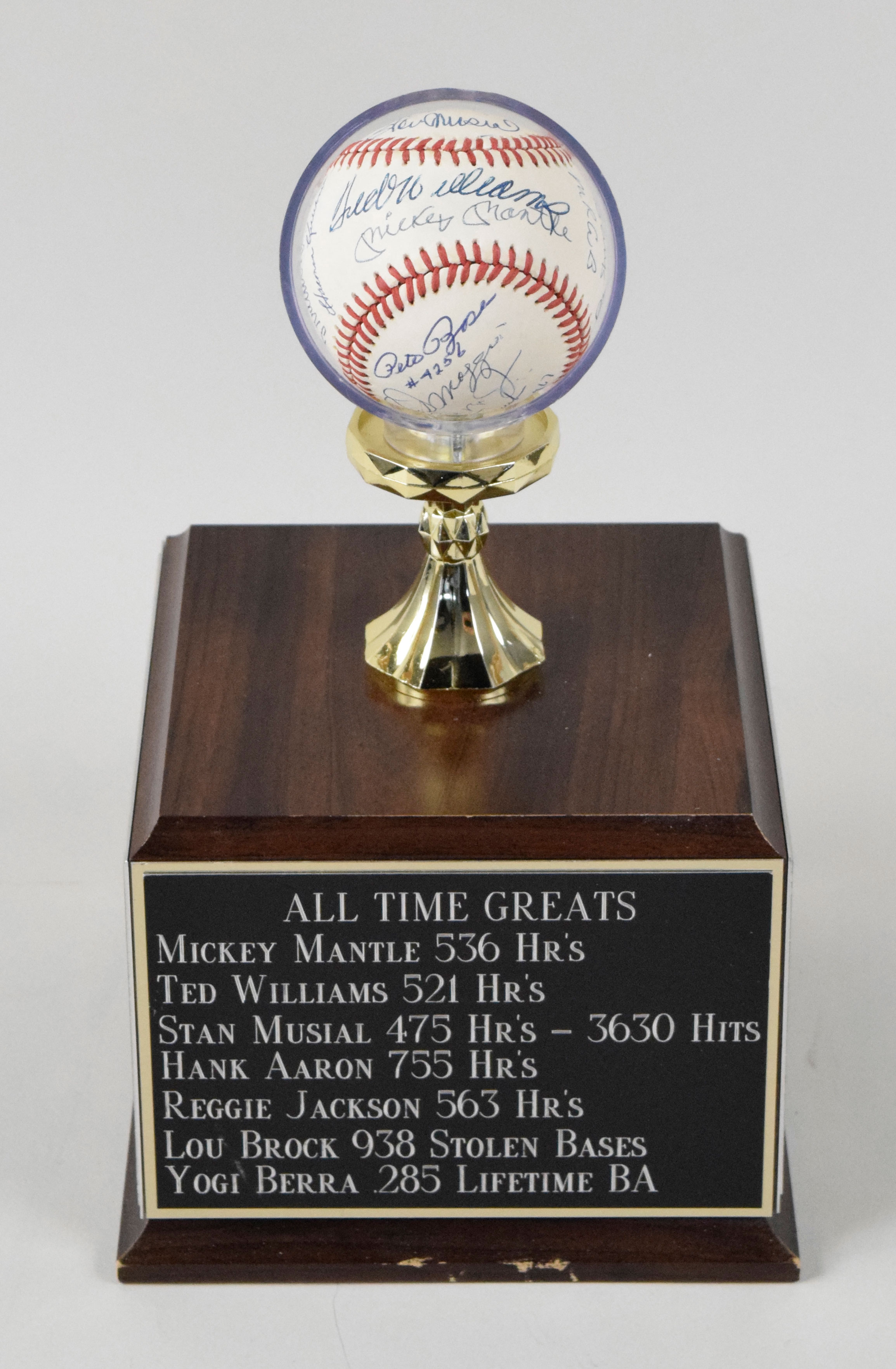 Description:"All-Time Greats" autographed baseball - (17) signatures incl. Mantle, Williams, and DiMaggio with custom display stand (EX/MT) Rawlings B.Brown OAL ball has been signed by Mickey Mantle, Ted Williams, Joe DiMaggio, Pete Rose (4256 inscription), Cal Ripken Jr, Carl Yastrzemski (TC 1967 inscription), Lou Brock, Reggie Jackson, Hank Aaron, Yogi Berra, Stan Musial, Willie McCovey, Mike Schmidt, Ernie Banks (Mr Cub inscription), Eddie Murray, Frank Robinson, and Harmon Killebrew. All are done in ink and generally rate 8 out of 10 or better with Ripken a touch lesser. Touch of light scattered toning. Includes a custom display stand (11" tall with 6.5" square base - some wear to stand): EX/MT ($1,000-$1,500)