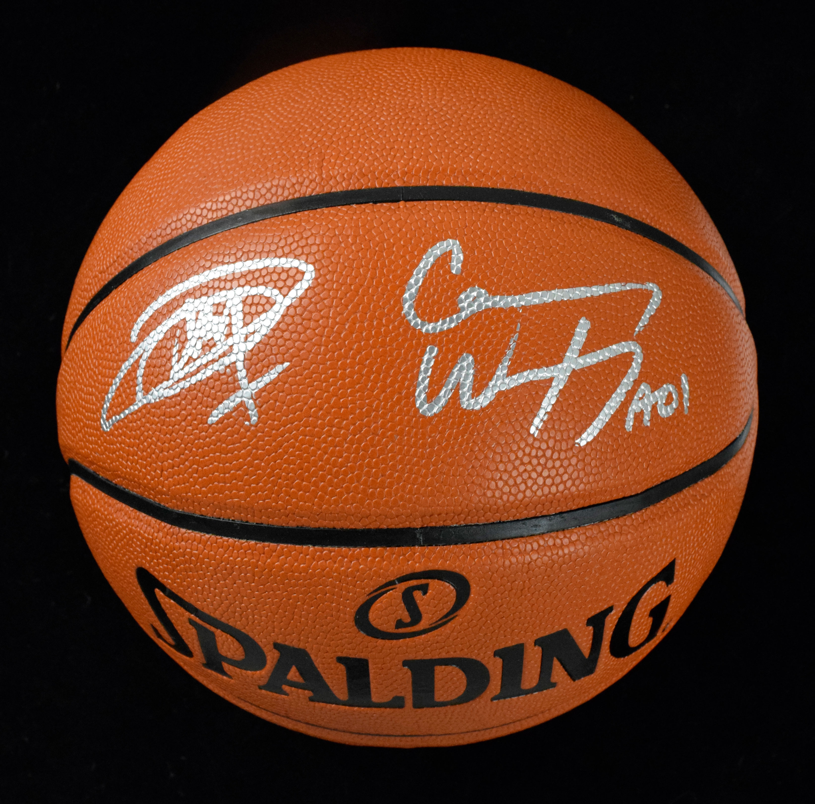Description:Joel Embiid and Carson Wentz autographed Spalding basketball with Fanatics auth (Sigs. MT). Like-new A. Silver official game ball series basketball has been signed on the top panel in silver marker by Joel Embiid and Carson Wentz, rating 9 out of 10. A Fanatics authentication sticker is affixed to the basketball, which is slightly deflated and includes a Fanatics pouch: NM.