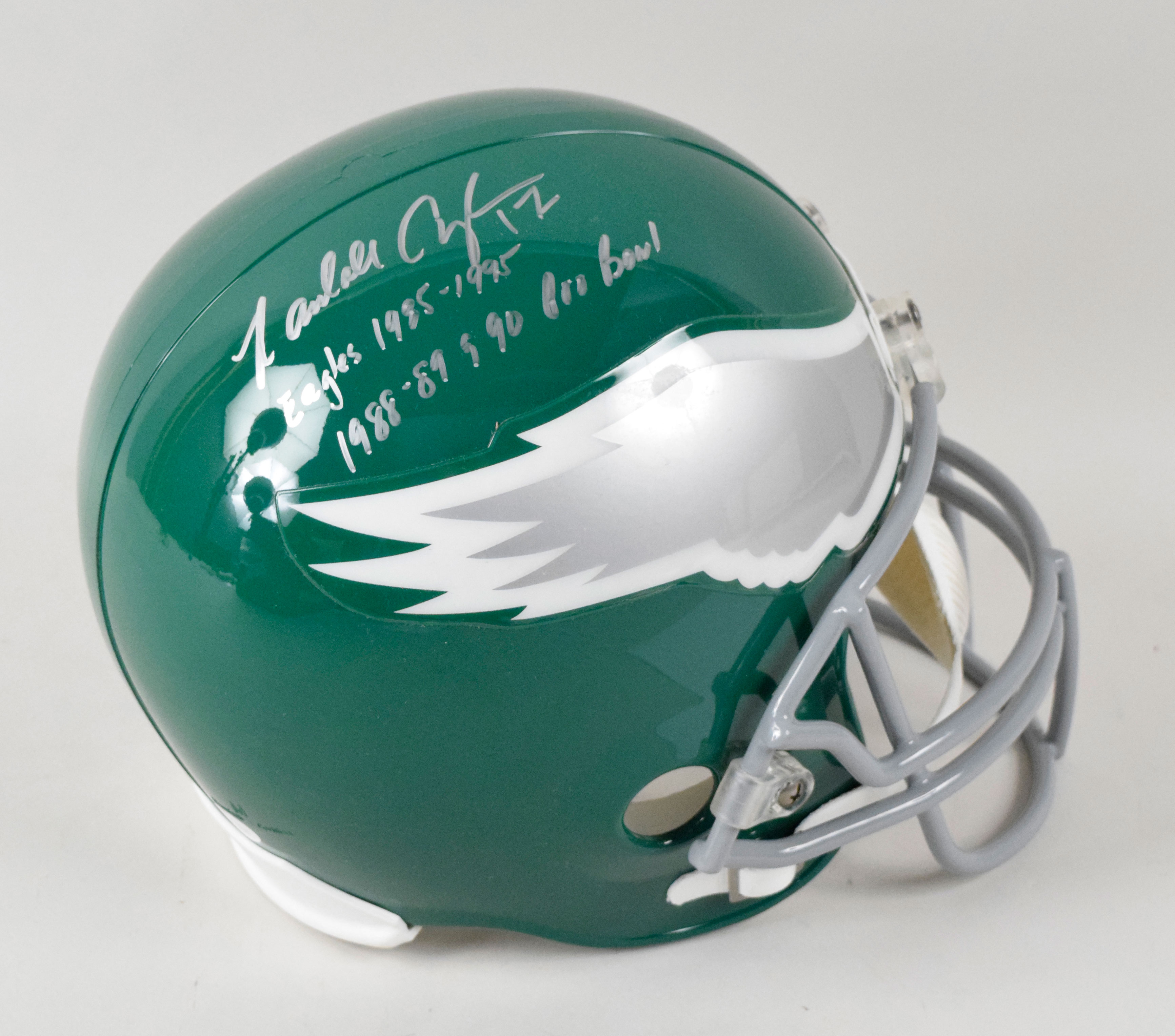 Description:Randall Cunningham signed and inscribed Philadelphia Eagles replica helmet with JSA cert. (Sig. MT). Nice Eagles replica helmet has been signed in silver marker with "Eagles 1985-1995 and 1988-89 1990 Pro Bowl" inscriptions, rating 9 out of 10. A JSA authentication sticker has been affixed to the back of the helmet, and a basic cert is also included. Helmet has little to no wear: NM/MT.
