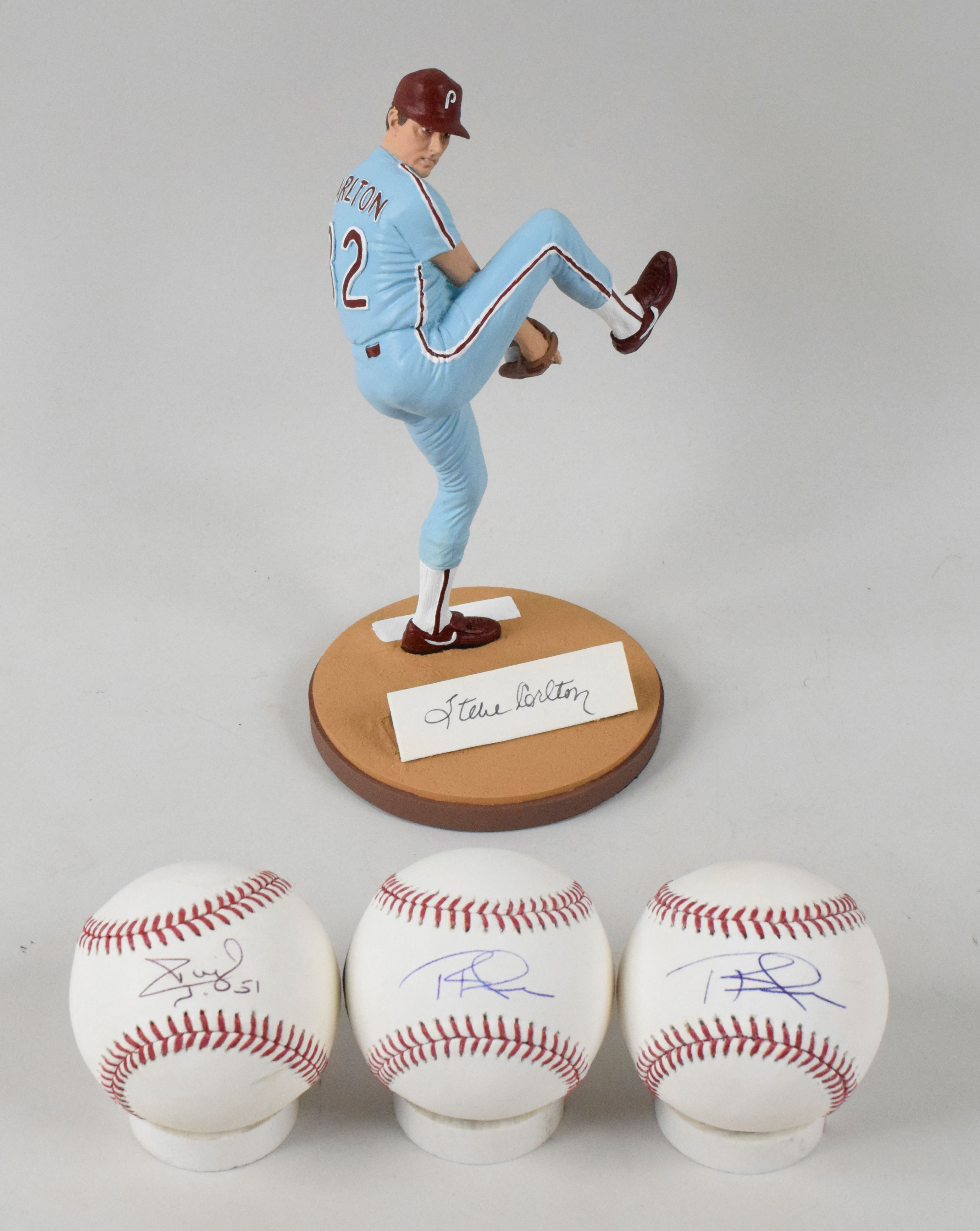 Description:Collection of Philadelphia Phillies signed an unsigned items, including Steve Carlton Gartlan (VG-MT). Assortment of Phillies items includes (1) Steve Carlton autographed Gartlan figure in original box; (2) stadium giveaway nodders (Cole Hamels in box with major wear and Carlos Ruiz not in box, missing bat); (2) R. Manfred MLB baseballs, each signed by Rhys Hoskins (one with JSA sticker and basic cert, the other with Fanatics sticker); (1) B. Selig MLB ball signed by Carlos Ruiz with MLB authentication sticker and (11) 2014 Bowman Draft Chrome Rhys Hoskins cards (MT). Signatures rate 8/9 out of 10, and items range VG-MT.