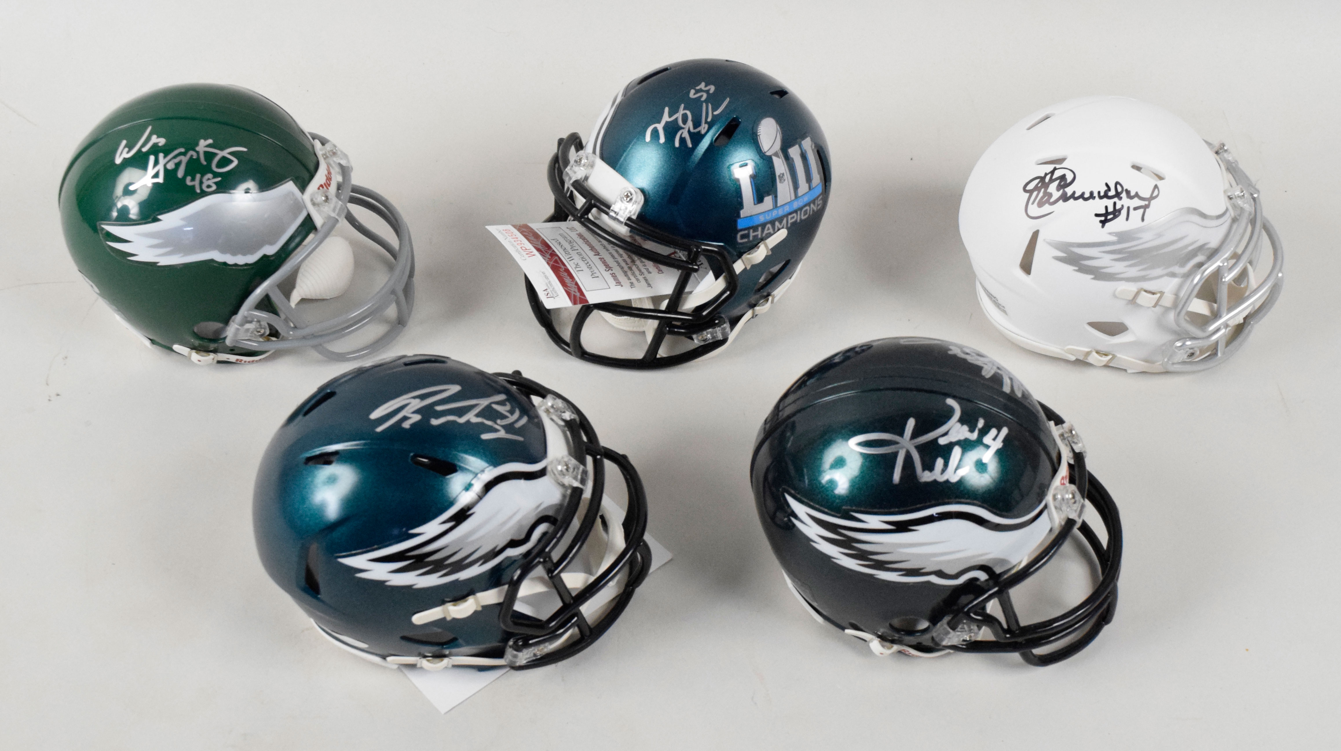 Description:Lot of (5) autographed Philadelphia Eagles mini-helmets, including Carmichael and multi-signed (Sigs. NM/MT-MT). Includes (1) replica helmet signed by Harold Carmichael with Beckett authentication sticker and basic cert; (1) replica Super Bowl LII logo helmet signed by Nigel Bradham with JSA authentication sticker and basic cert; (1) replica Super Bowl LII logo helmet signed by Ronald Darby with JSA authentication sticker and basic cert; (1) Riddell helmet signed by Wes Hopkins and (1) Riddell helmet signed by Kevin Kolb, DeSean Jackson and Trent Cole. Signatures rate 8/9 out of 10, and helmets appear NM.