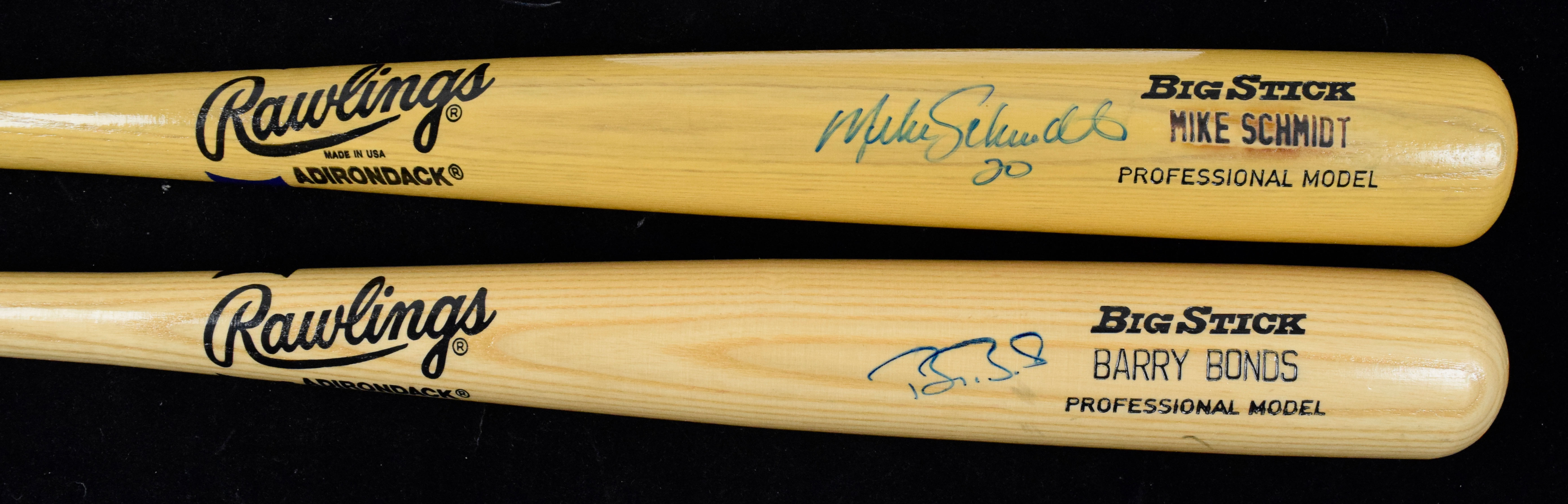 Description:Lot of (2) autographed baseball bats, with Barry Bonds and Mike Schmidt (Sigs. NM). Nice lot of signed bats includes (1) 34" Adirondack Big Stick Mike Schmidt model bat signed by Schmidt in blue marker and (1) 34" Adirondack Big Stick Barry Bonds model bat signed by Bonds in blue marker. Signatures rate 7 out of 10, and bats appear NM.