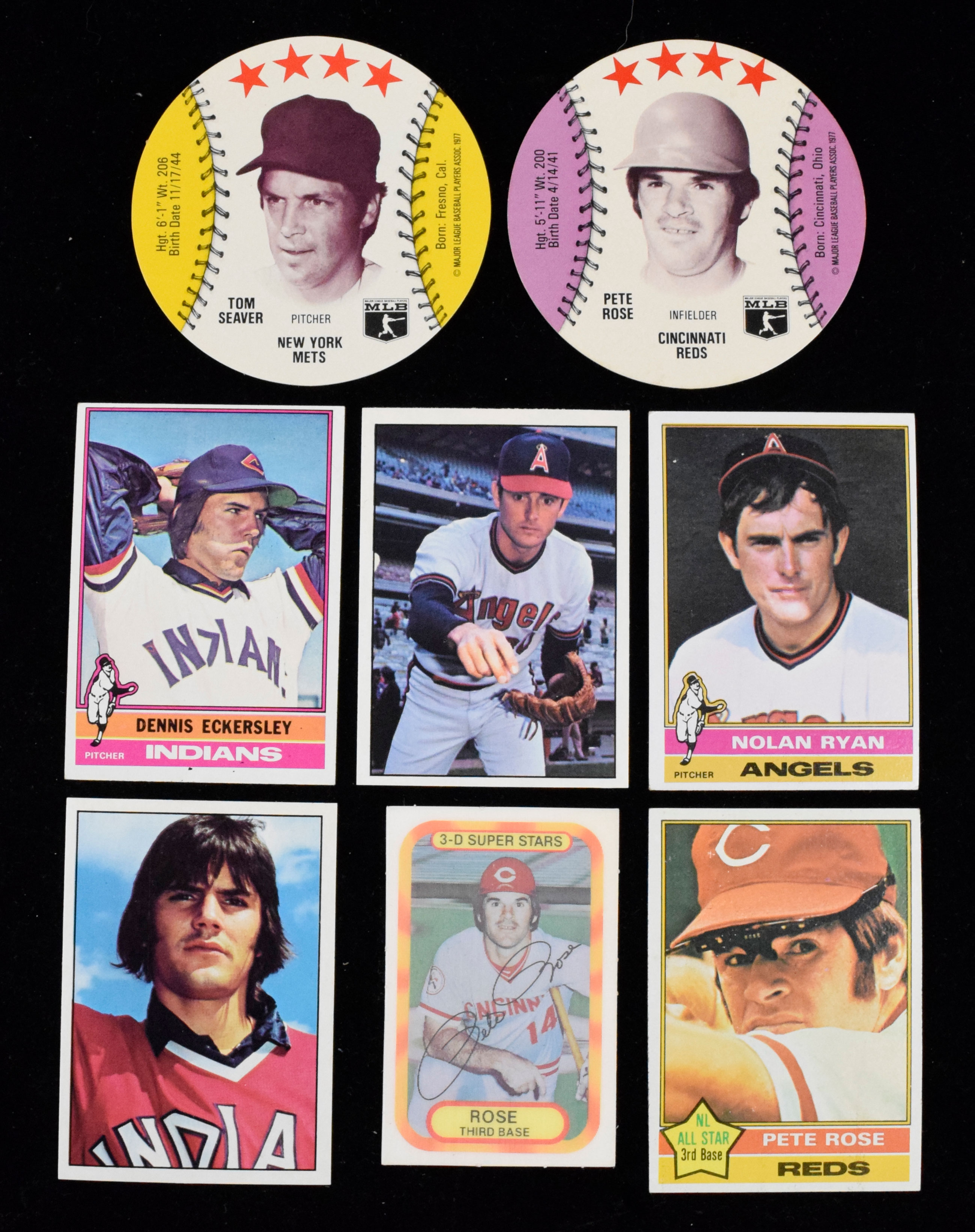 Description:Breakdown value lot 1970s-1980s baseball cards, with binders, 1976 Topps HOFers, 1977 discs (PR-MT). Good quantity of cards includes (1) binder with dozens of mid-1970s Topps and SSPC stars and Hall of Famers, with some of the better cards including 1976 Topps #s 330 Nolan Ryan, 600 Tom Seaver, 355 Steve Carlton, 98 Dennis Eckersley RC, 300 Johnny Bench, 240 Pete Rose, 19 George Brett, 316 Robin Yount, 230 Carl Yastrzemski, 500 Reggie Jackson and 197^ SSPC #s 187 Nolan Ryan, 506 Dennis Eckersley, 238 Robin Yount, 167 George Brett and more (binder also has 1970s-80s Sports Illustrated covers and some complete magazines). Also includes (1) 1976 SSPC partial set (approx. 500 diff); (1) 1976 Topps partial set in binder (approx. 400 diff.); (1) binder of (500+) mostly 1980s cards, including 1977 and 1981 Kellogg's near or complete sets; (50+) 1977 MSA discs, including Pete Rose, Tom Seaver, Mike Schmidt and others, plus a few others sports cards mixed in. Most cards appear EX-NM. Range: PR-MT.