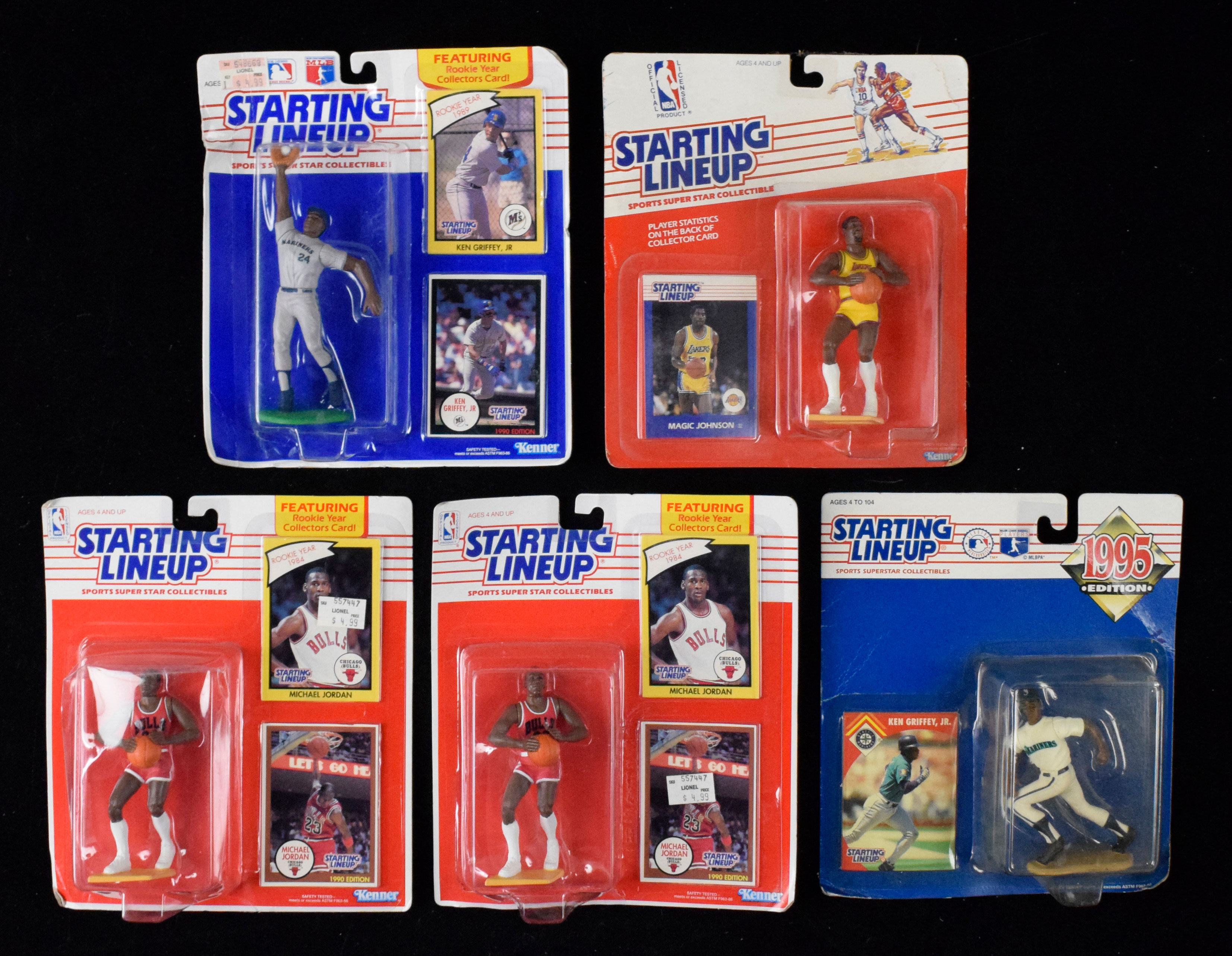 Description:Lot of (30+) 1980s-90s Starting Lineup figures in original boxes, including (2) Michael Jordan (Boxes: VG-VG/EX). Most remain on-card with a one separated from its packaging, with wear to nearly all of the boxes. Includes mostly baseball with some basketball and one football. Highlights include (2) 1990 Michael Jordan; (1) 1988 Magic Johnson, (3) Ken Griffey Jr., Mickey Mantle/Joe DiMaggio, (3) Nolan Ryan, Tony Gwynn, Babe Ruth/Lou Gehrig, Bo Jackson and more. Most figures appear NM/MT (in box), while boxes show moderate to heavy wear: VG-VG/EX.