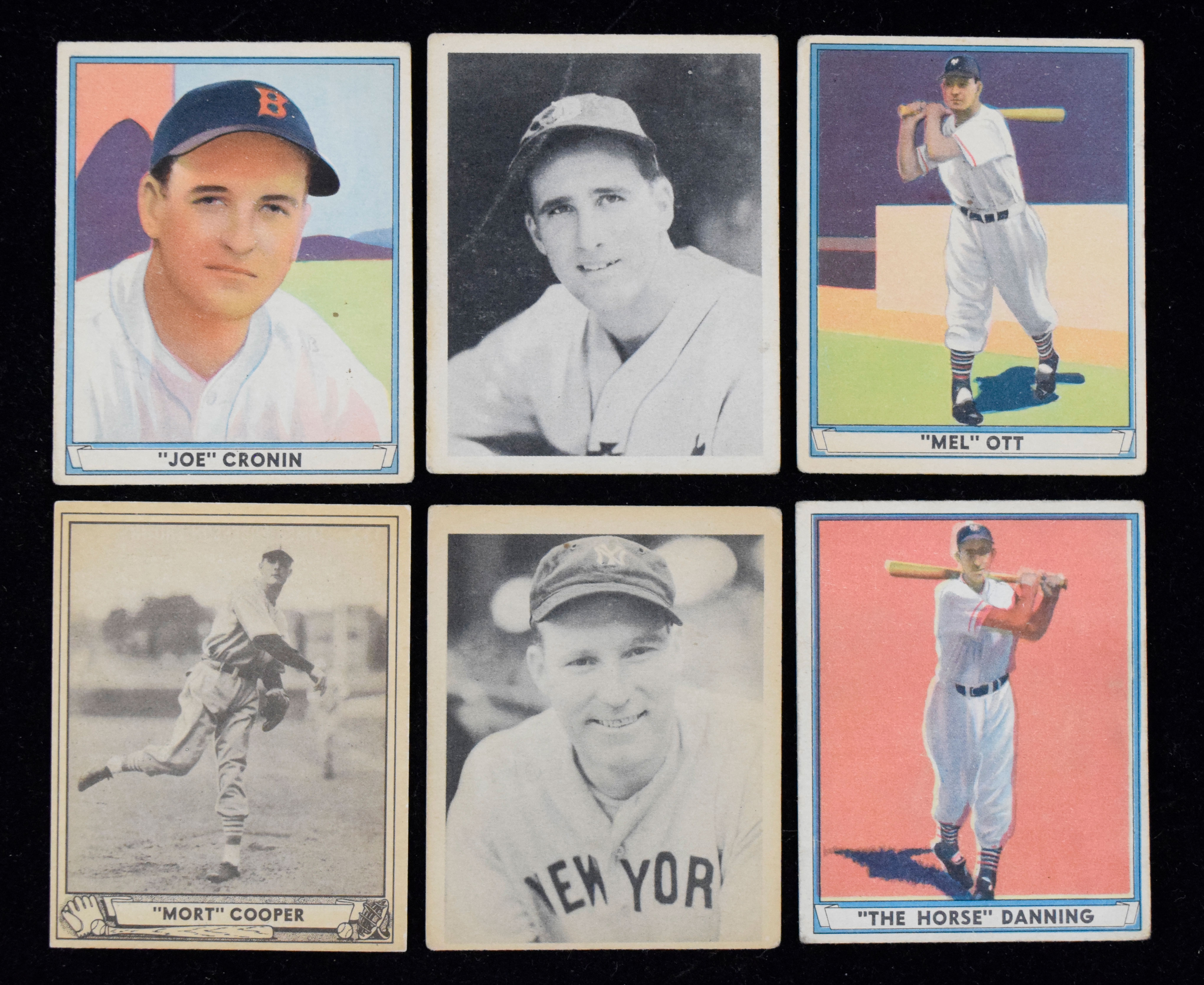 Description:Lot of (7) 1939-1941 Play Ball cards, including Greenberg, Cronin and Ott (PR-EX). Assortment of Play Ball cards includes (3) 1939: #s 3 Red Ruffing (VG), 56 Hank Greenberg (PR), 86 Dolph Camilli (PR); (1) 1940 #122 Mort Cooper (EX) and (3) 1941: #s 8 Mel Ott (GD), 15 Joe Cronin (VG) and 7 Harry Danning (FR). Range: PR-EX.