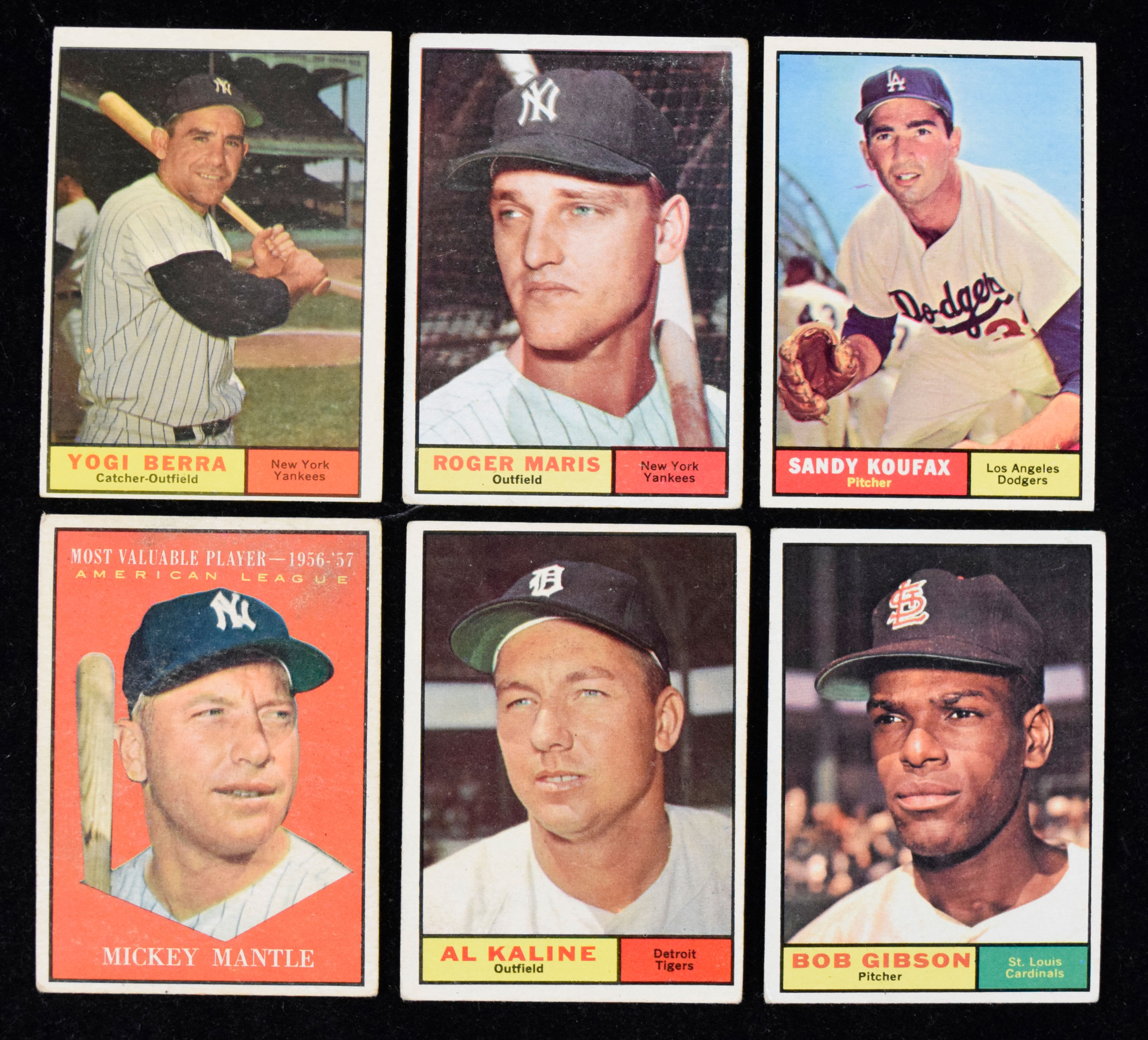 Description:Lot of (10) 1961 Topps stars and HOFers, including Koufax, Mantle MVP and Maris (PR-EX/MT). High-value lot of assorted 1961 Topps key cards, with #s 475 Mickey Mantle MVP, 260 Don Drysdale, 30 Nellie Fox, 290 Stan Musial, 2 Roger Maris, 344 Sandy Koufax, 120 Eddie Mathews, 425 Yogi Berra, 429 Al Kaline and 211 Bob Gibson. Most appear VG-VG/EX. Range: PR-EX/MT.