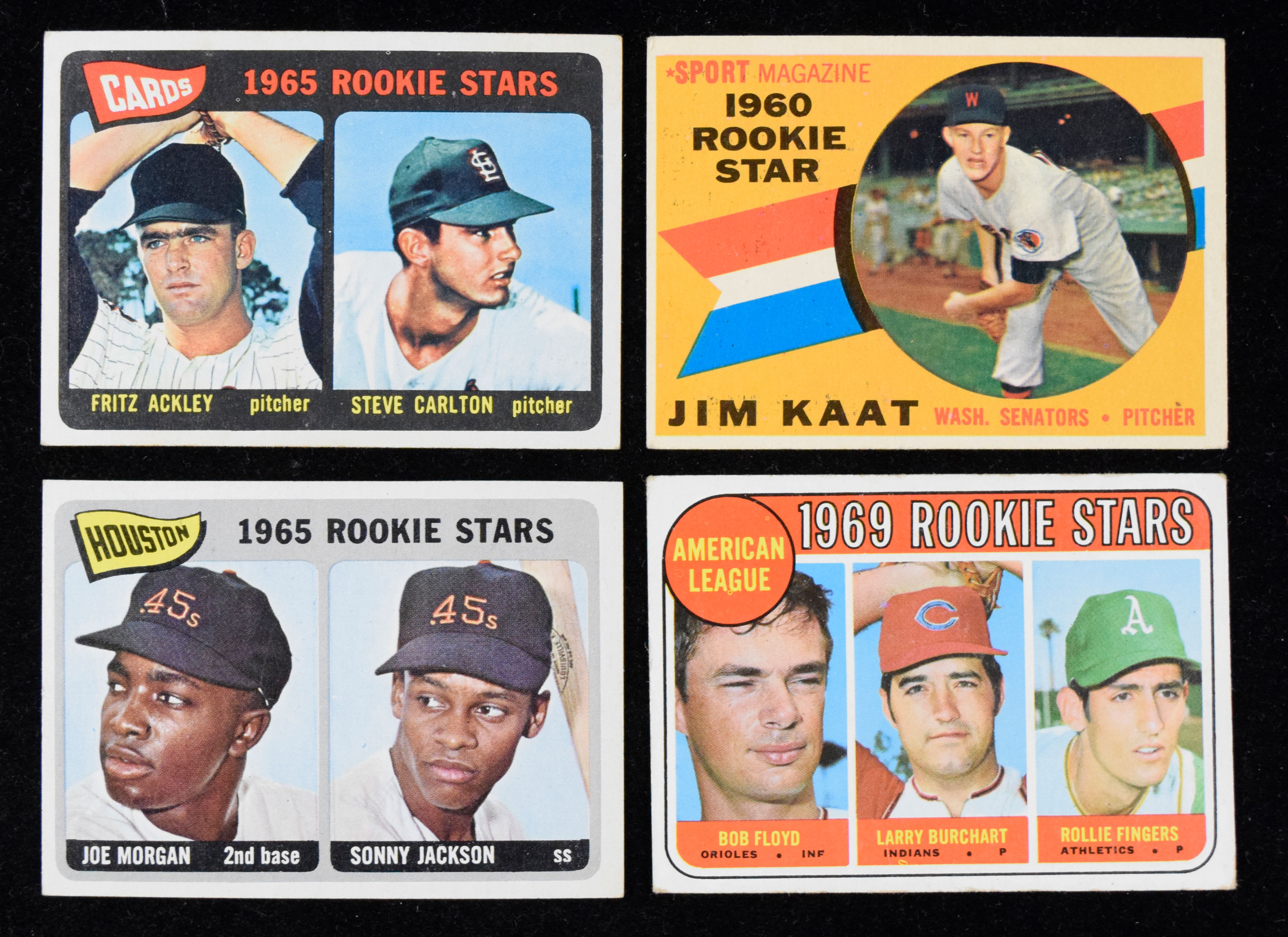 Description:Lot of (4) 1960s Topps RCs, including Carlton, Morgan, Kaat and Fingers (VG-EX). Nice assortment of key Topps rookies from the 1960s, with 1960 # 136 Jim Kaat (VG/EX); (2) 1965: #s 16 Joe Morgan (EX) & 477 Steve Carlton (VG) and 1969 #597 Rollie Fingers (VG). Range: VG-EX.