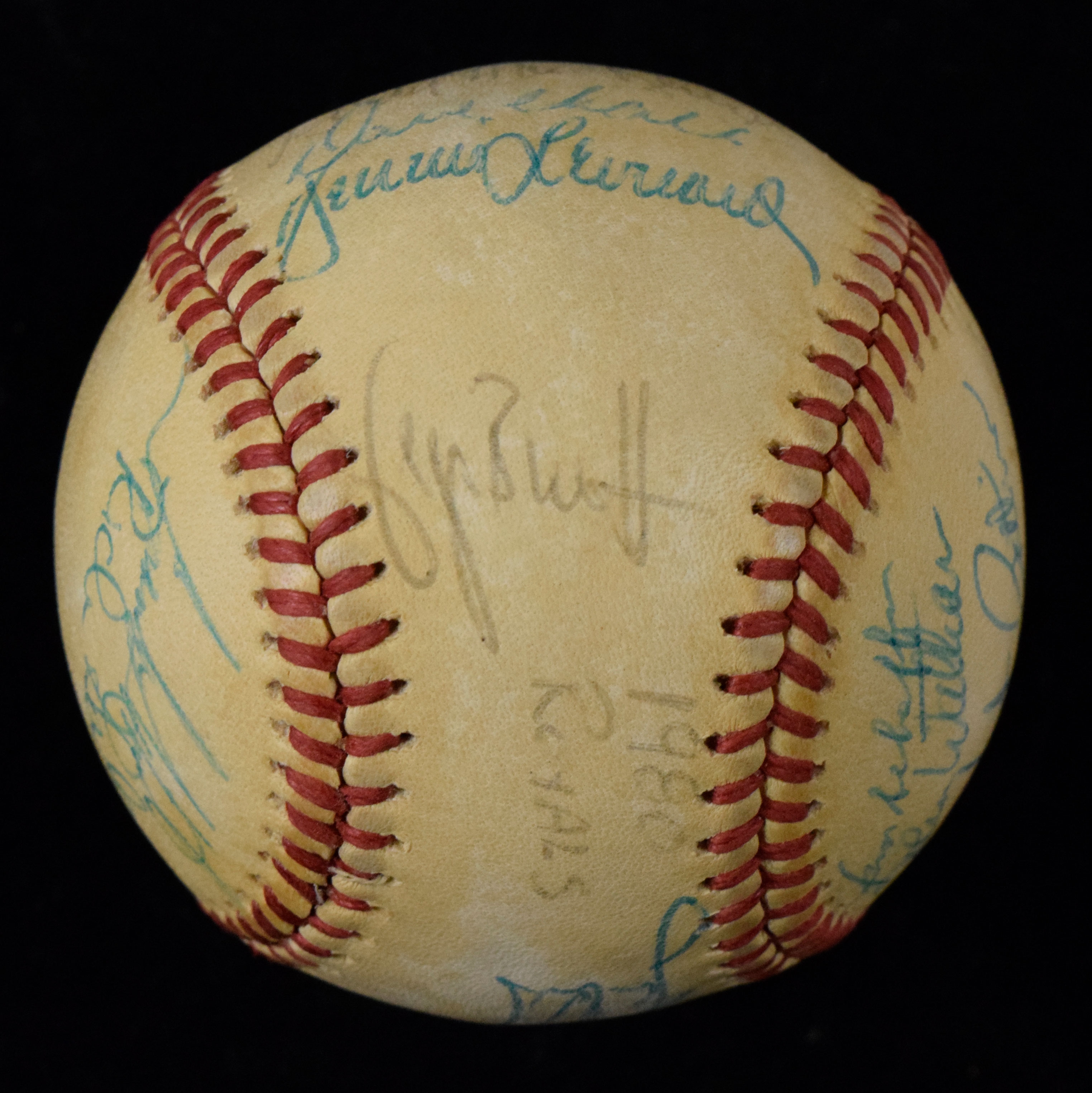 Description:1980 Kansas City Royals team-signed baseball with (21) signatures, including George Brett (Sigs. VG-NM). Excellent generic baseball (no stamping) has been signed by (21) members of the 1980 World Series team, including George Brett, Ken Brett, Willie Wilson, John Wathan, Dennis Leonard, U.L. Washington, Frank White and others. "1980 Royalds" is written on the sweet spot. Signatures range from 3 to7 out of 10 (avg. 5) and ball has moderate to heavy toning: VG/EX.