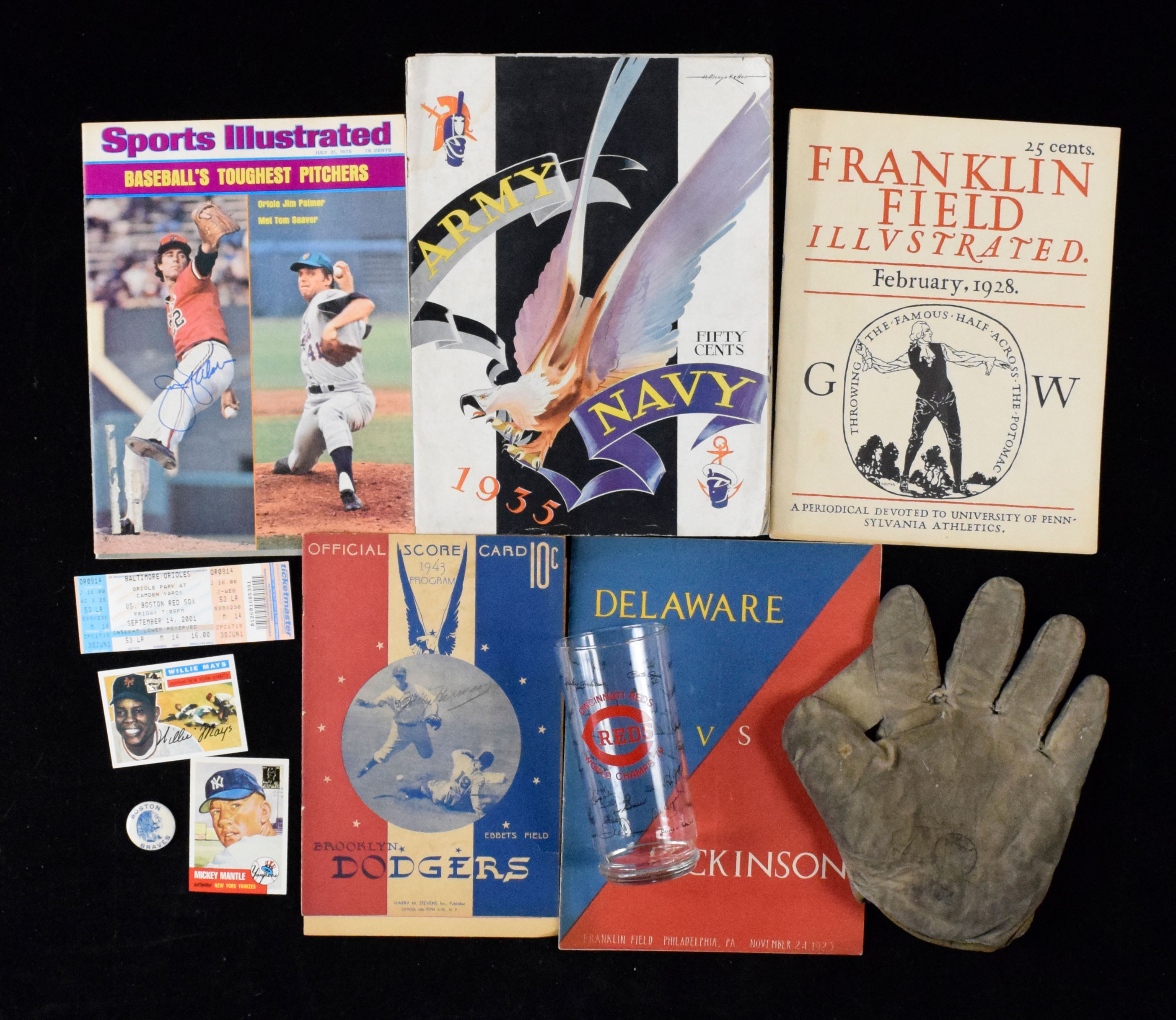 Description:Excellent Group lot of 1920s-1990s memorabilia, including publications, cards and autographs (PR-NM) Interesting assortment of mostly baseball memorabilia should yield excellent breakdown value, with several binders full of mostly modern cards (including inserts and many reprint cards), vintage and modern publications, magazine and newspaper cutouts and some autographed items scattered around. Highlights include 1980s Phillies team signed ball with very light signatures, including Mike Schmidt; 1950s Boston Braves stadium pin; several 1976 Cincinnati Reds World Champs glasses; Sept. 14, 2001 Baltimore Orioles full ticket (ticket issued for Cal Ripken Jr.'s last game but was postponed due to 9/11); Nolan Ryan, Jim Palmer and Brooks Robinson autographed items; 1920s-1950s publications including 1936 and 1943 Baseball Magazine, 1958 Sports Illustrated, 1934 and 1935 Army vs. Navy programs, 1928 and 1930 Franklin Field Illustrated, 1921 Mid -Week Pictorial with Babe Ruth in center photo display, 1923 Delaware vs. Dickinson FB program; 1943 Brooklyn Dodgers scorecard (secretarial/clubhouse signatures) and 1950 New York Yankees scorecard; vintage Reach store model glove and more. Signatures range from 2 to 7/8 out of 10 and items range PR-NM.