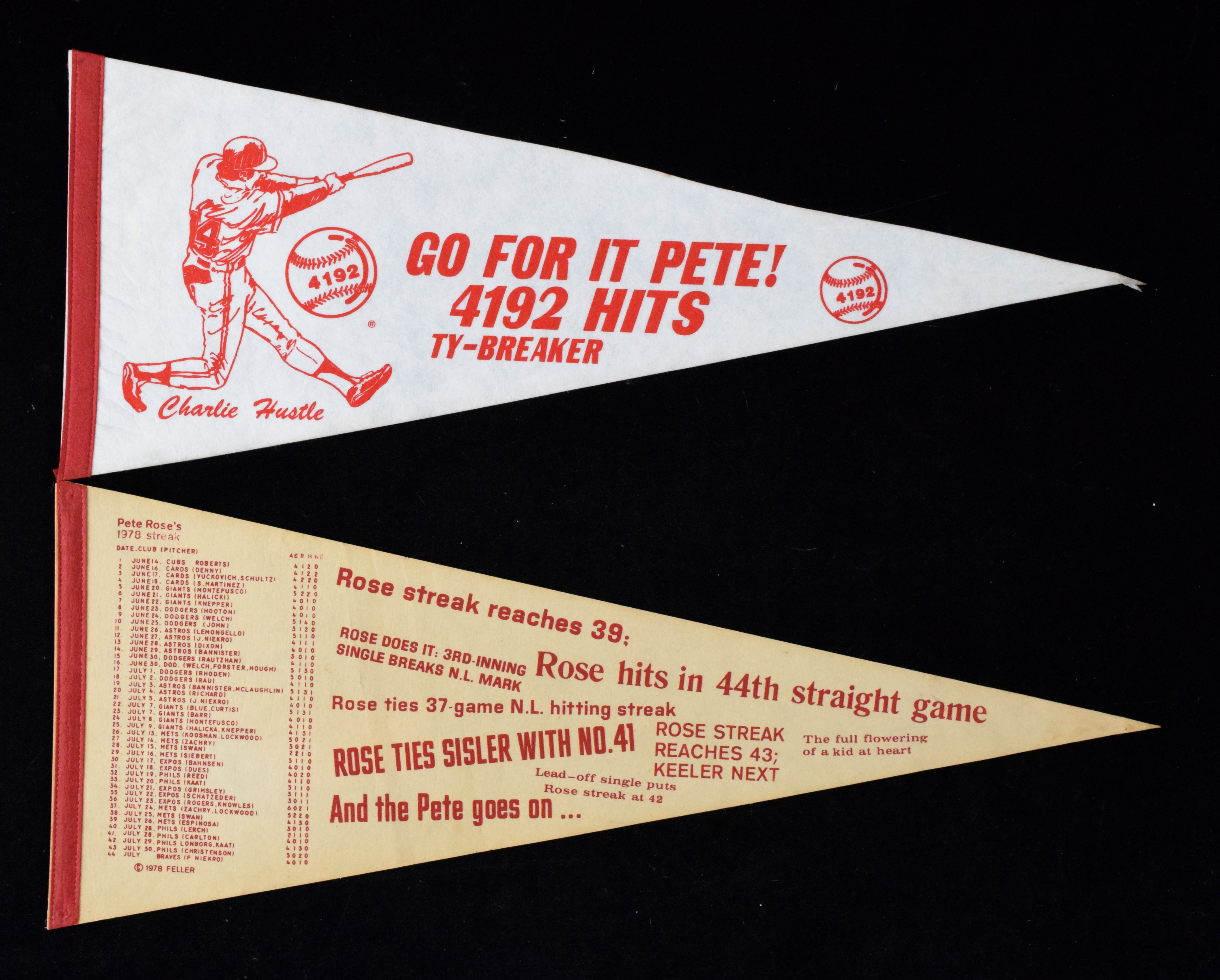 Description:Lot of (2) Pete Rose full-size pennants, with hit streak and career hits (VG/EX). Nice lot devoted to Rose hitting achievements, with (1) 30" 1978 Rose 44-game hit streak white pennant with screened-on red text (VG/EX) and (1) 29 1/2" 1985 Rose 4192 hits white pennant with screened-on red text (VG/EX). Range: VG/EX.