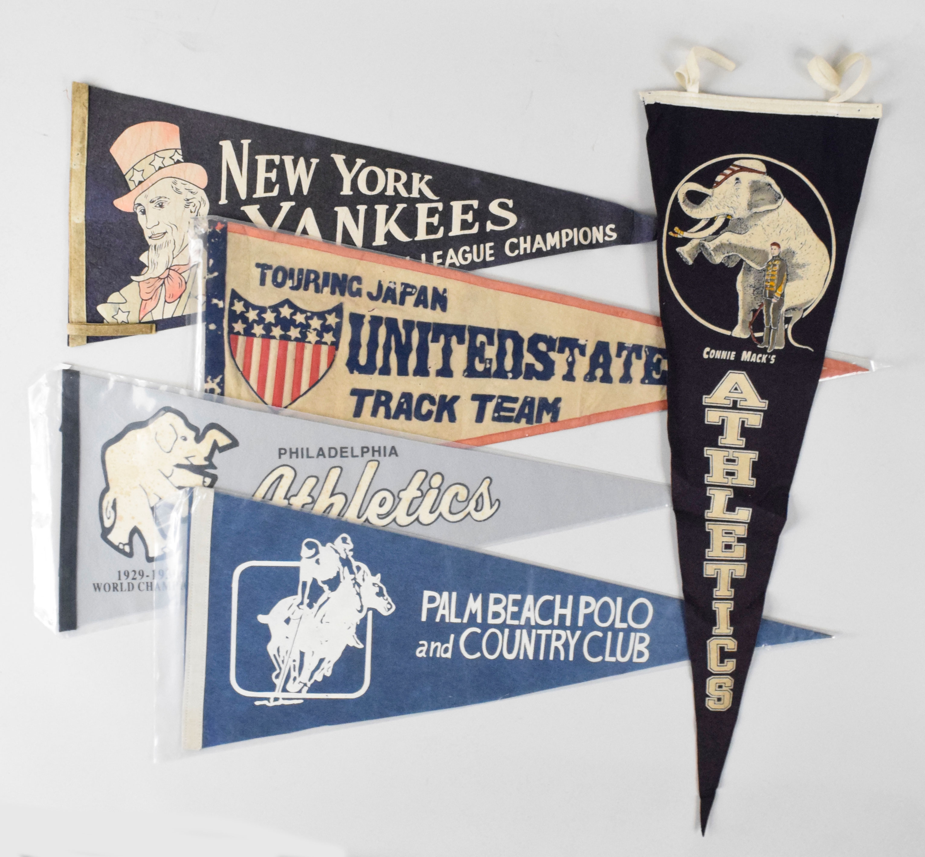 Description:Lot of (7) 1930s-1980s full-size pennants, including Yankees and Athletics (GD-EX). Includes a mix of vintage and modern pennants, with baseball and other spots, including (1) 29 1/2" New York Yankees American League Champions; (1) 34" Connie Mack's Athletics pennant (modern reproduction; (1) 29 1/2" Philadelphia Athletics 1929-1930 World Champions; (1) 30" 1934 United States Track Team Touring Japan pennant; (1) 29 1/12" 1954 British Empire Games pennant; (1) 30" Palm Beach Polo and Country Club pennant and (1) 28" U.S. National Tennis Championships Forest Hills pennant. Range: GD-EX.