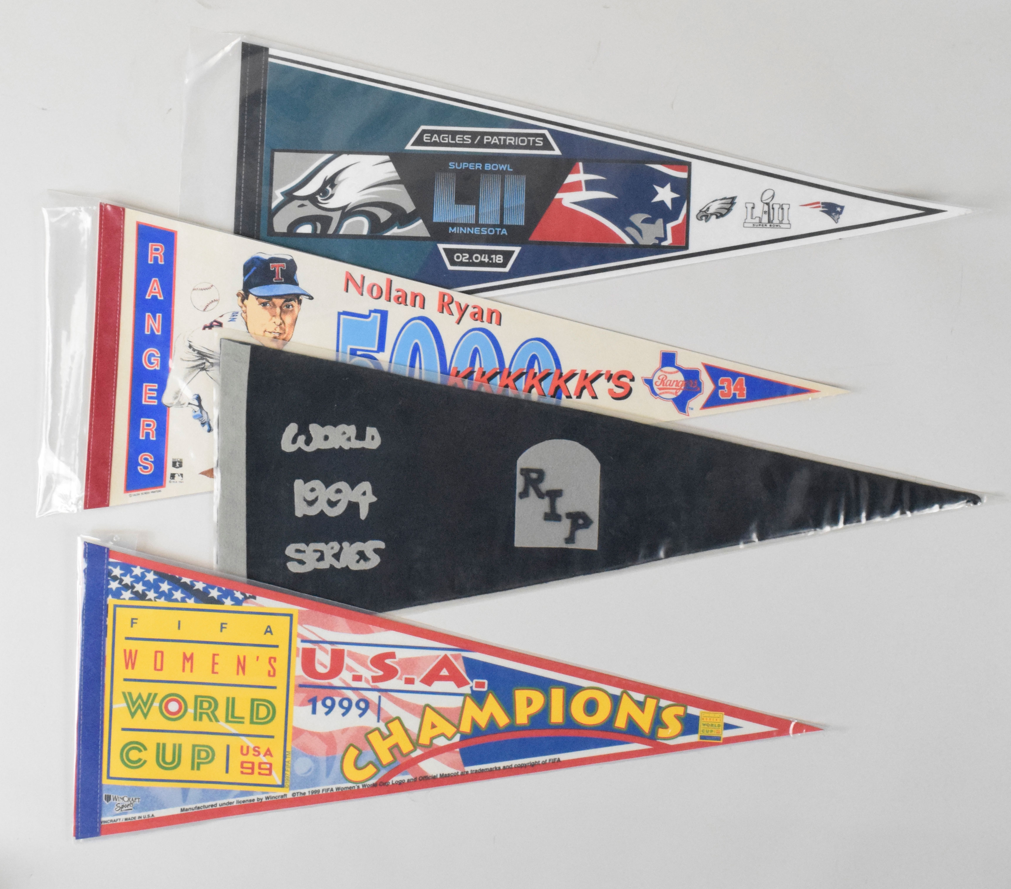 Description:Lot of (10) modern full-size pennants, including Nolan Ryan and Eagles Super Bowl (VG/EX-EX/MT). Assortment of modern full-size pennants includes (1) 1994 World Series RIP; (1) Nolan Ryan 5,000 Ks; (1) Richie Ashburn 1995 HOF; (2) Wilmington Blue Rocks; (1) Eagles vs. Patriots Super Bowl LII; (1) 2000 Sydney Olympic Games baseball; (1) 2015 Ohio State National Championship; (1) Florida Atlantic Owls; (1) 1999 Women's FIFA World Cup. Range: VG/EX-EX/MT.