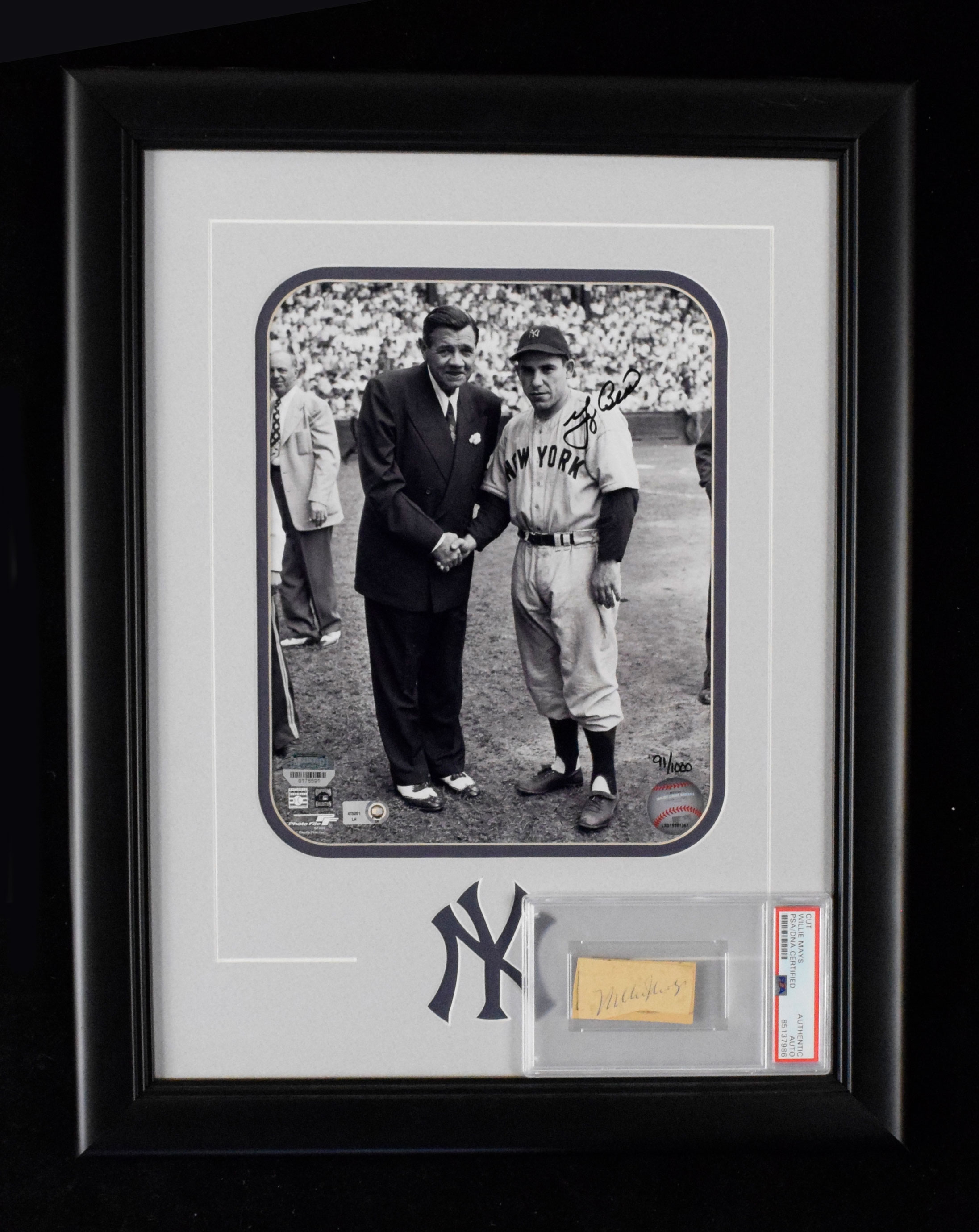 Description:Lot of (2) autographed pieces, with Willie Mays cut signature and Yogi Berra framed photo (Sigs. NM-MT). Nice lot of Hall of Famer autographs, with (1) Willie Mays cut signature (PSA/DNA Authentic Auto), rating 7 out of 10 and (1) Yogi Berra and Babe Ruth photo, framed to approx. 14"x18 and signed by Berra, rating 9 out of 10 with Mounted Memories authentication sticker and basic cert. Sigs: NM-MT.