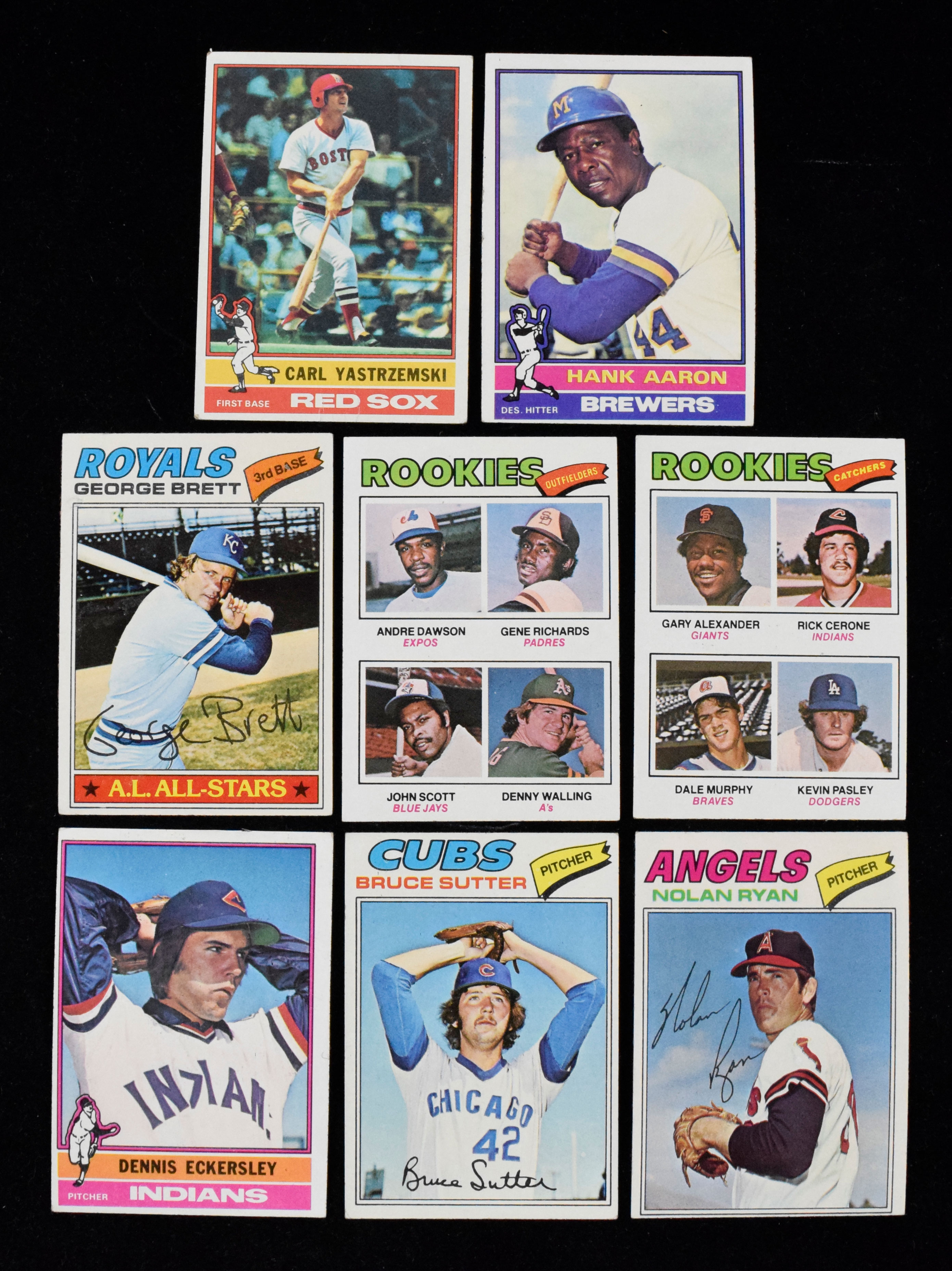 Description:Lot of (2) 1976 and 1977 Topps partial sets with HOFers and RCs, including Eckersley and Dawson RCs (PR-EX). Lot is optimal for someone looking to complete 1976 and 1977 Topps sets. Includes a 1976 Topps partial with 623 diff. cards (a few are OPC), plus a 44-card Traded set for a (667/704) partial set, and a (605/660) 1977 Topps partial set. Both sets are missing several key Hall of Famers and RCs, but both also include a good portion of the key cards. Most cards appear VG-VG/EX, including some marked checklists. Range: PR-EX.