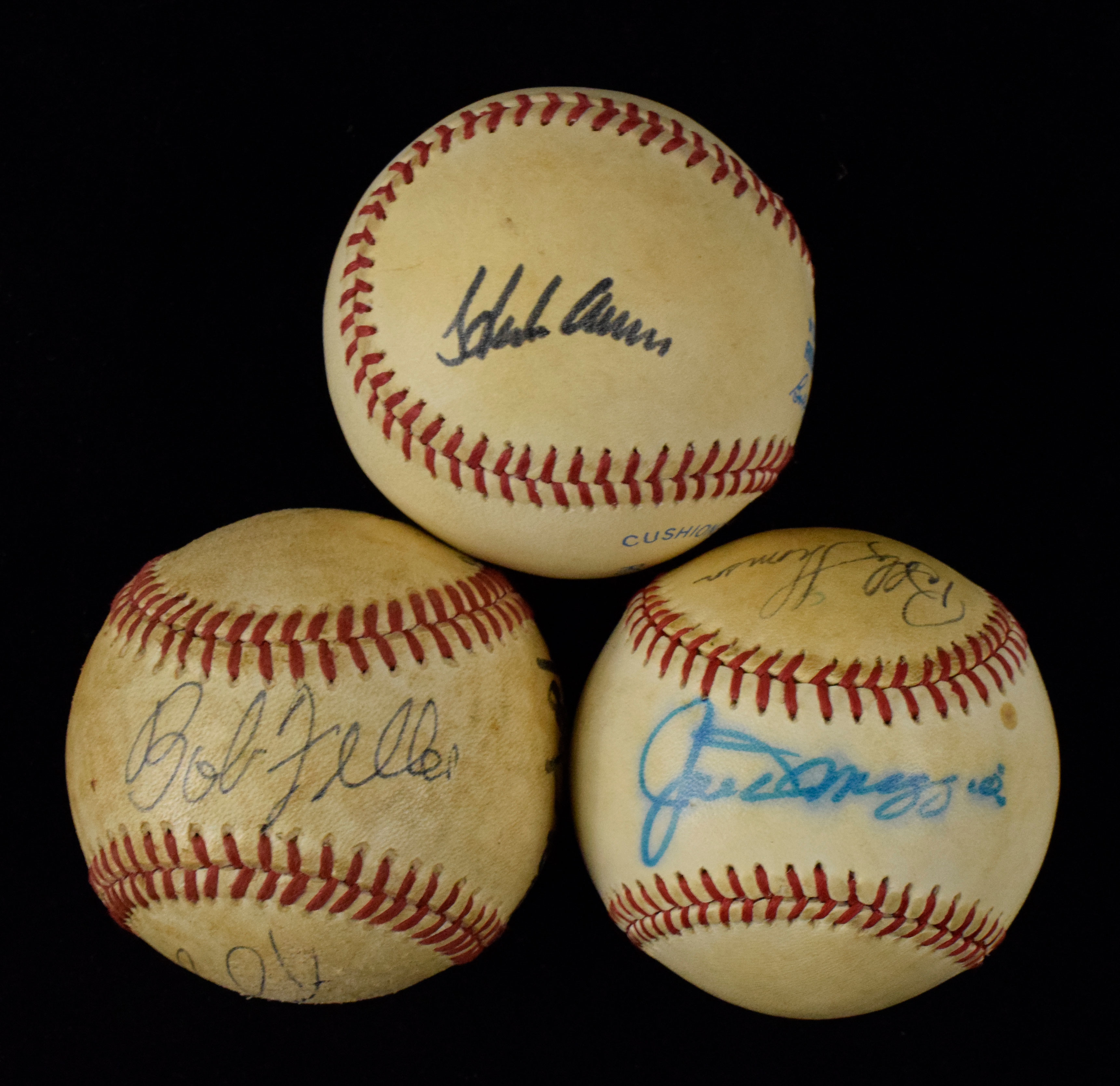 Description:Lot of (3) autographed baseballs, including Hank Aaron and Joe DiMaggio multi-signed (Sigs. EX/MT-NM/MT). High-value lot of signed baseballs includes (1) B. Brown A.L. ball signed on the side panel by Hank Aaron; (1) Official American Legion Baseball signed on the sweet spot by Bob Feller with additional side panel signatures from Greg Luzinski, Bobby Shantz, Bobby Thomson, Mickey Vernon and (1) Official American Legion Baseball signed on the sweet spot by Joe DiMaggio (slight ink bleed) with additional side panel signatures from Bobby Thomson, Bob Feller and Brooks Robinson. Signatures range from 6 to 8 out of 10 (avg. 7) and balls have moderate to heavy toning/wear: VG-EX.