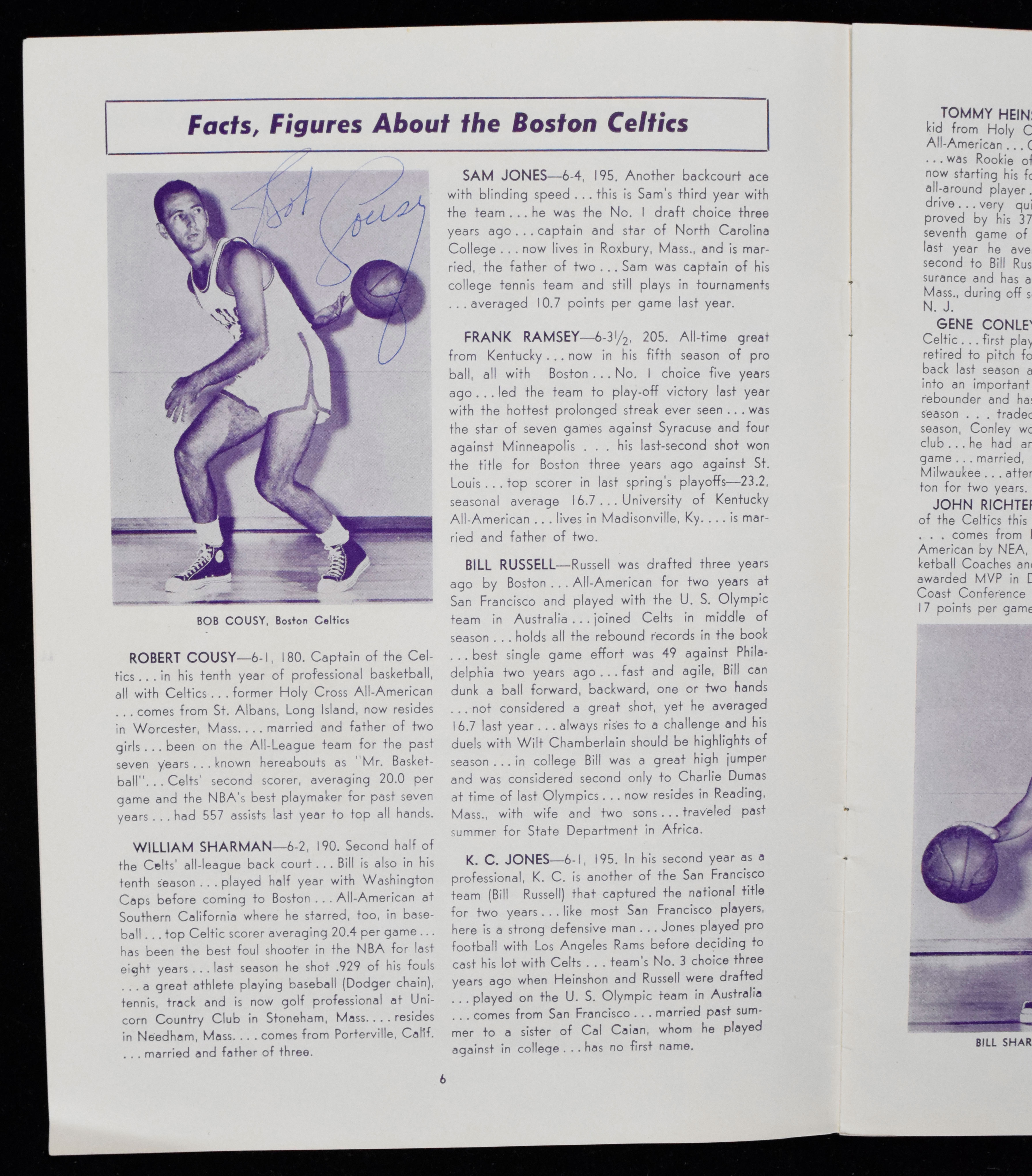 Description:1960 Knicks vs. Celtics program signed by Bob Cousy (Sig. NM). Outstanding program and scorecard (unscored) for the game between the Knicks and Celtics on Feb. 28, 1960 at Madison Square Garden has been signed on an inner page by Bob Cousy, rating 7 out of 10. Program has mostly light wear with a corner bend and scattered writing inside: EX.