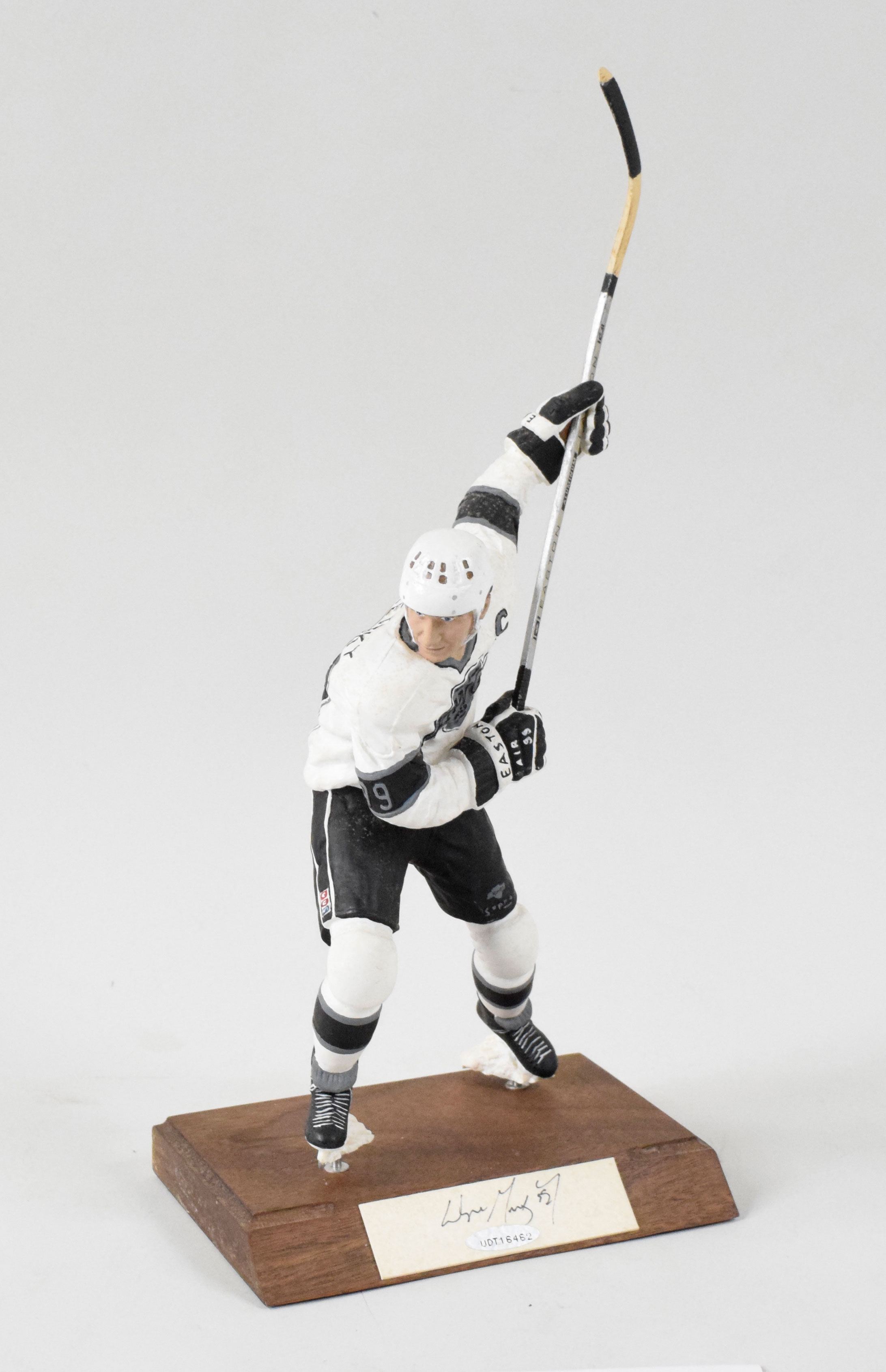 Description:1994 Salvino Wayne Gretzky autographed limited edition figurine in original box with UDA auth. (Sig. NM/MT). Outstanding figure of Gretzky in a Los Angeles Kings uniform is numbered to 1850 on underside of the base and signed by Gretzky in black marker, rating 8 out of 10 (light toning/spotting to nameplate, with Upper Deck Authenticated sticker affixed). Figure has light toning/spotting that potentially could be cleaned off. Box (with bubble wrap inside) has heavy wear with apparent moisture damage not affecting the figure: GD.