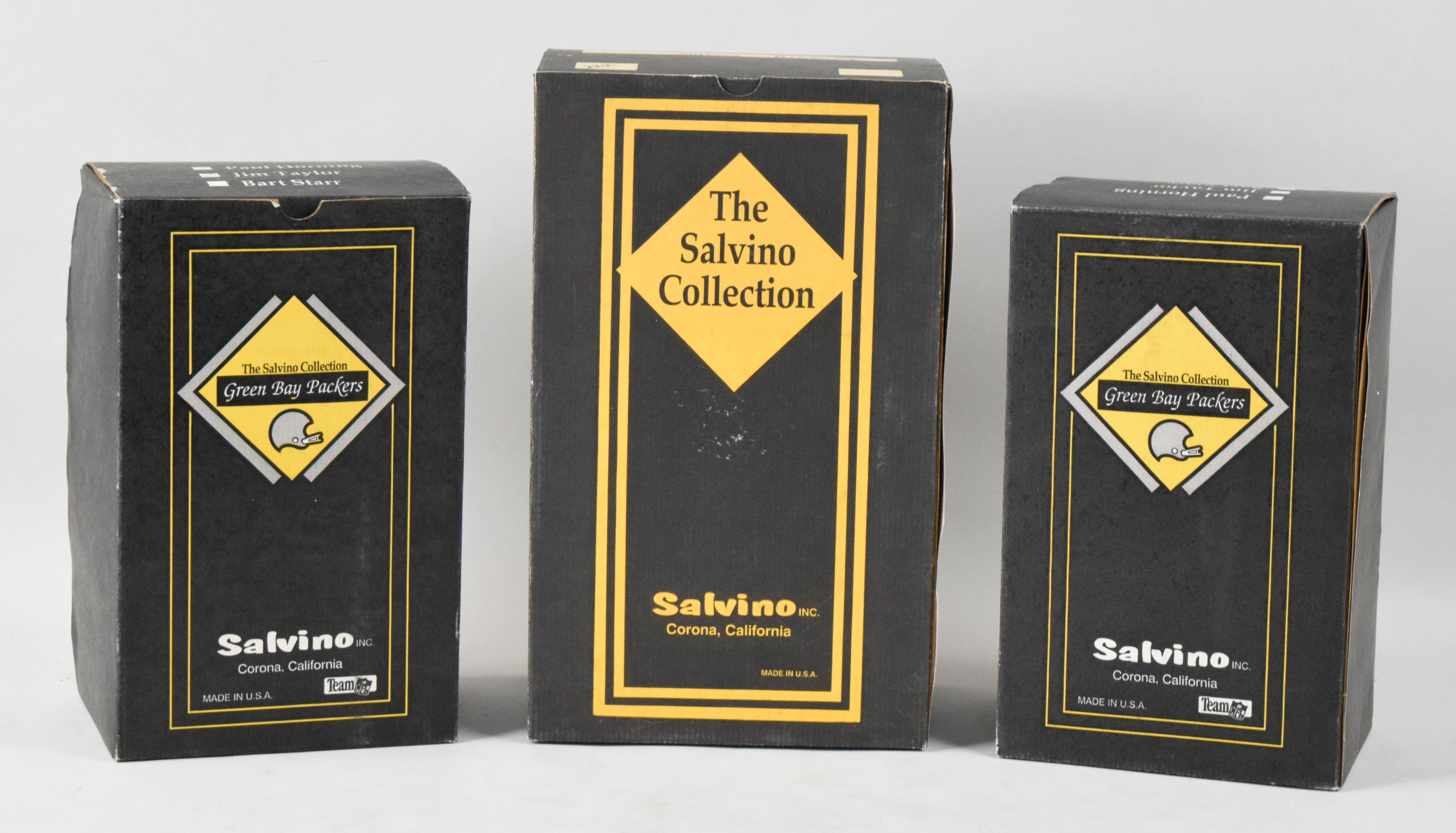 Description:Lot of (3) autographed FB Salvino figurines in original boxes with Simpson, Hornung & Taylor (Sigs. NM/MT-MT). High-quality lot of limited edition figurines, with each remaining in its original box and autographed by the player on the base (figurines in bubble wrap inside). Includes (1) Paul Hornung (#449/500); (1) O.J. Simpson (#222/1000; light toning/spotting to nameplate) and (1) Jim Taylor (#348/500). Signatures rate 8/9 out of 10, and figures appear NM. Boxes have mostly moderate shelf wear: VG/EX-EX.