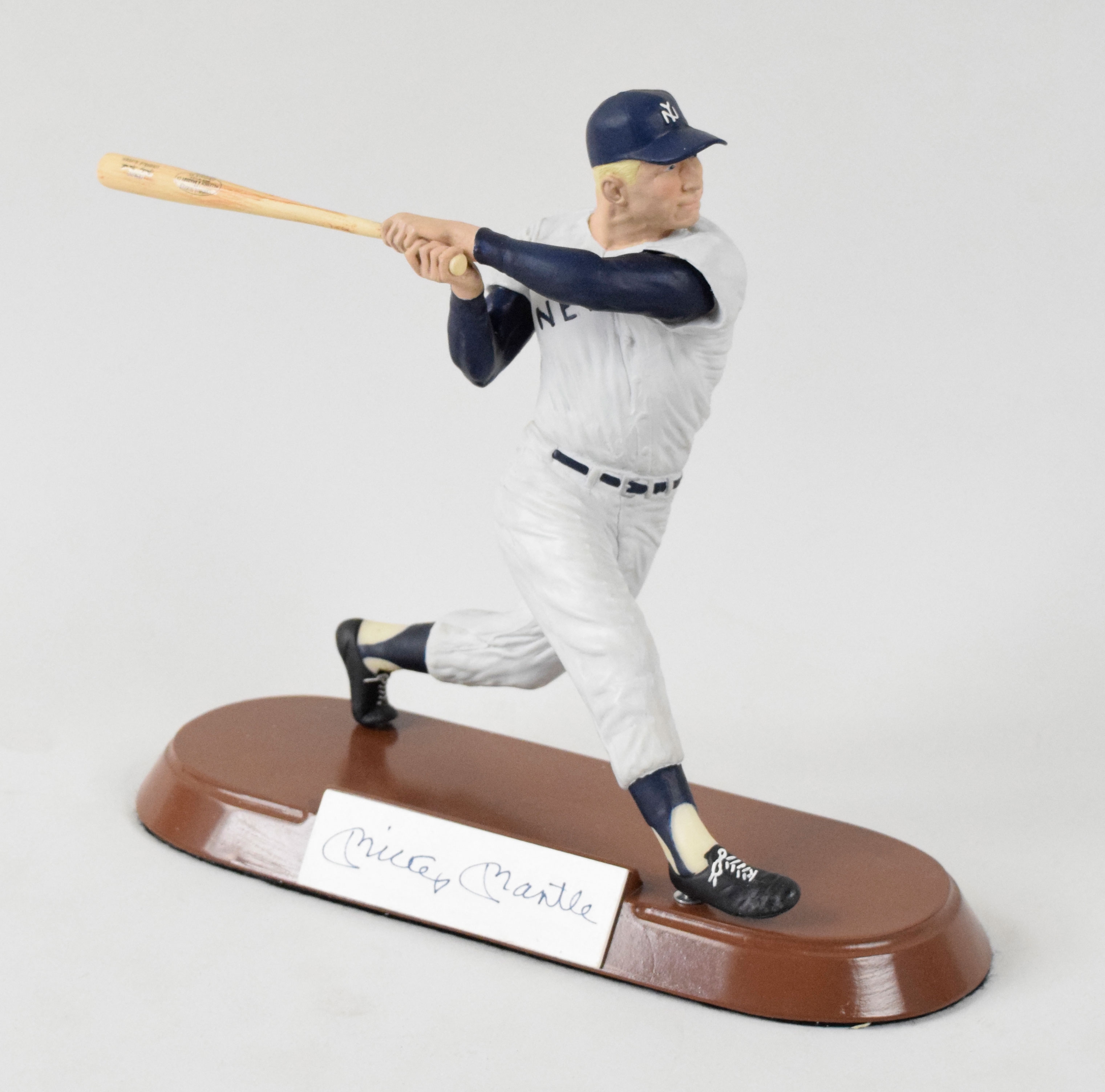 Description:1991 Salvino Mickey Mantle autographed limited edition figurine in original box (Sig. MT). Outstanding figure of the Yankees icon is numbered 439/1732 on underside of the base and signed by Mantle in blue marker, rating 9 out of 10. Base and figure have little mentionable wear: NM. Box has moderate shelf wear/possible moisture exposure not affecting the figure: VG/EX.