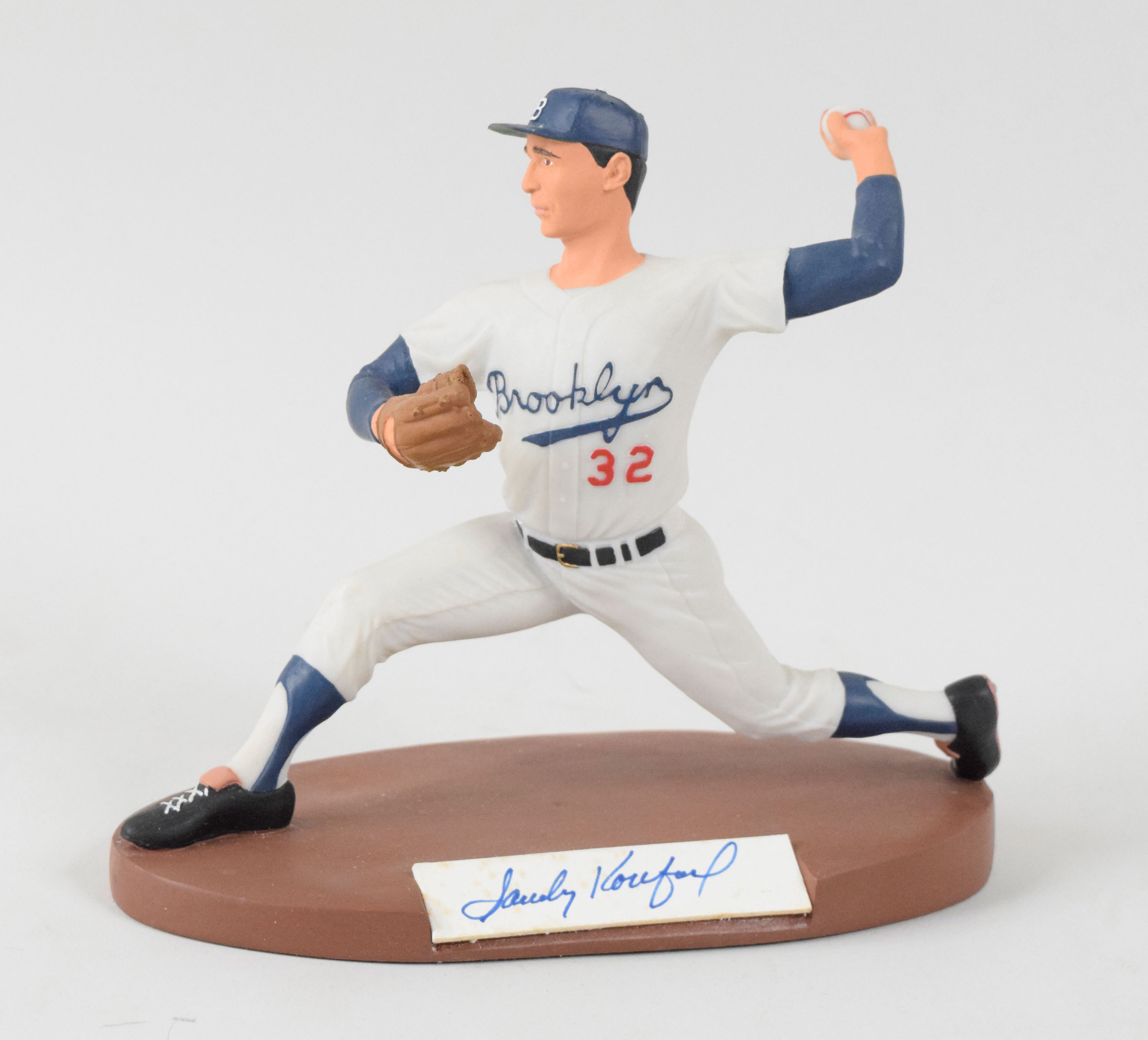 Description:1990 Salvino Sandy Koufax autographed limited edition figurine in original box (Sig. MT). Outstanding figure of the Dodgers ace is numbered 1274/2500 on underside of the base and signed by Koufax in blue marker, rating 9 out of 10 (nameplate has some toning/spotting). Figure has little mentionable wear: NM. Box has moderate shelf wear: EX.