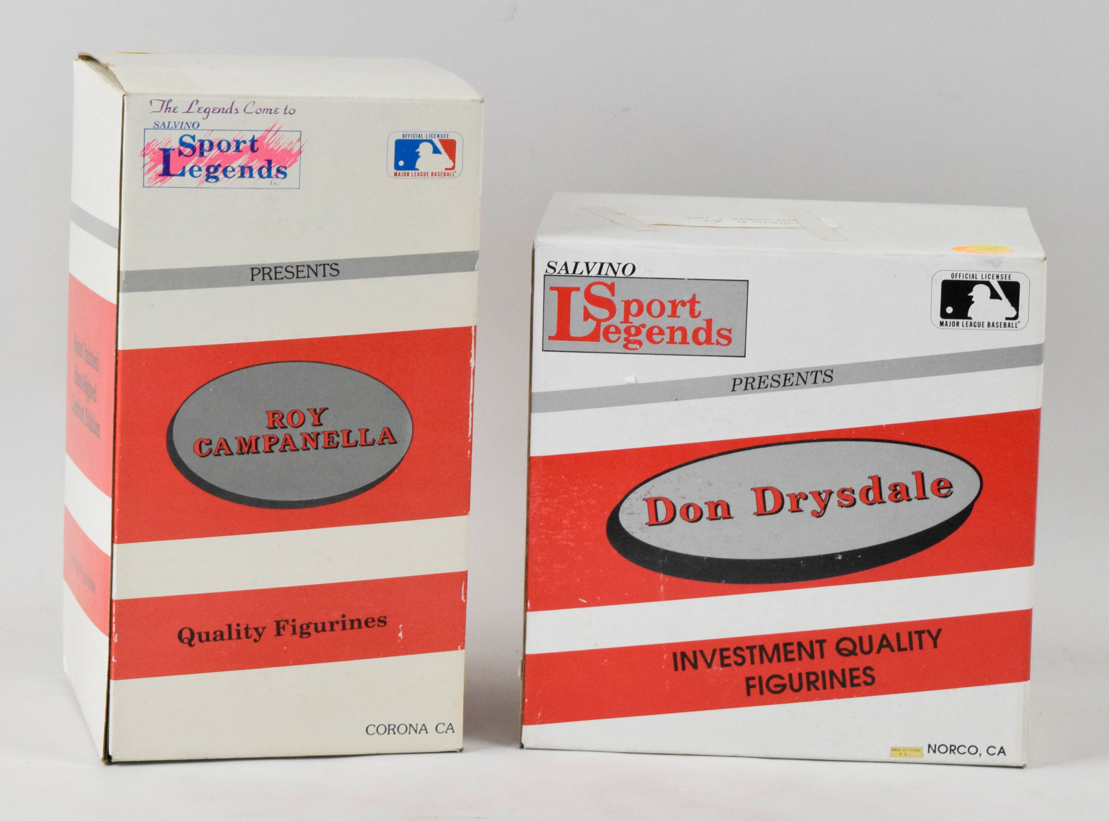 Description:Lot of (2) autographed Dodgers Salvino figurines in original boxes, with Drysdale & Campanella (Sigs. NM/MT-MT). High-quality lot of limited edition figurines, with each remaining in its original box and autographed by the player on the base. Includes (1) Roy Campanella (#396/2000; toning/spotting to figure and nameplate and (1) Don Drysdale (#1015/2500; toning/spotting to figure and nameplate). Signatures rate 8/9, and figures appear EX (due to toning/spotting). Boxes have mostly moderate shelf wear: EX.