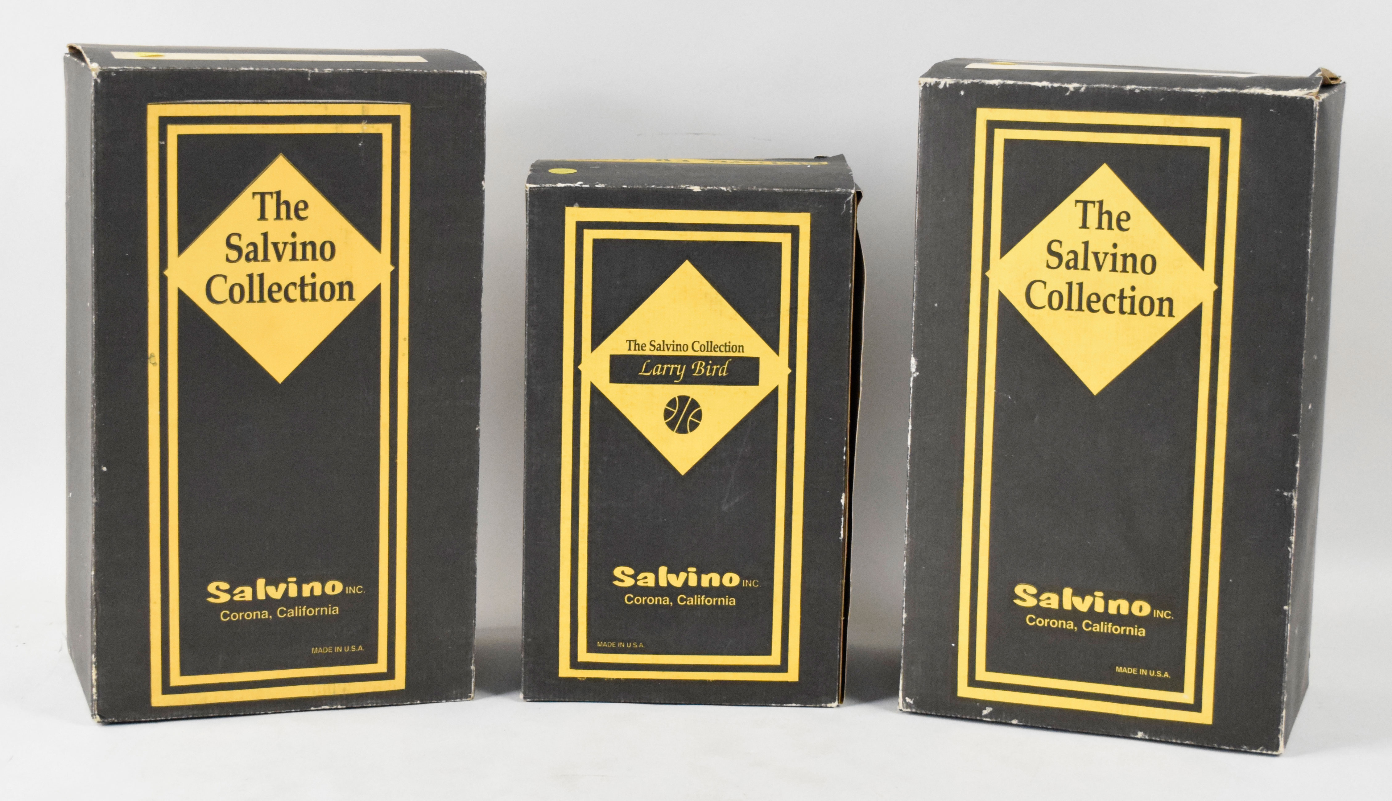 Description:Lot of (3) autographed Larry Bird Salvino figurines in original boxes (Sigs. NM-NM/MT). High-quality lot of limited edition figurines, with each remaining in its original box and autographed by the player on the base (figurines in bubble wrap inside). Includes (1) Larry Bird home uniform (#25/950); (1) Larry Bird away uniform (#288/500); and (1) Larry Bird home uniform (#12/500; light toning/spotting to nameplate. Signatures rate 7/8 out of 10, and figures appear NM. Boxes have mostly moderate wear, some with apparent moisture damage not affecting the figures: VG-VG/EX.