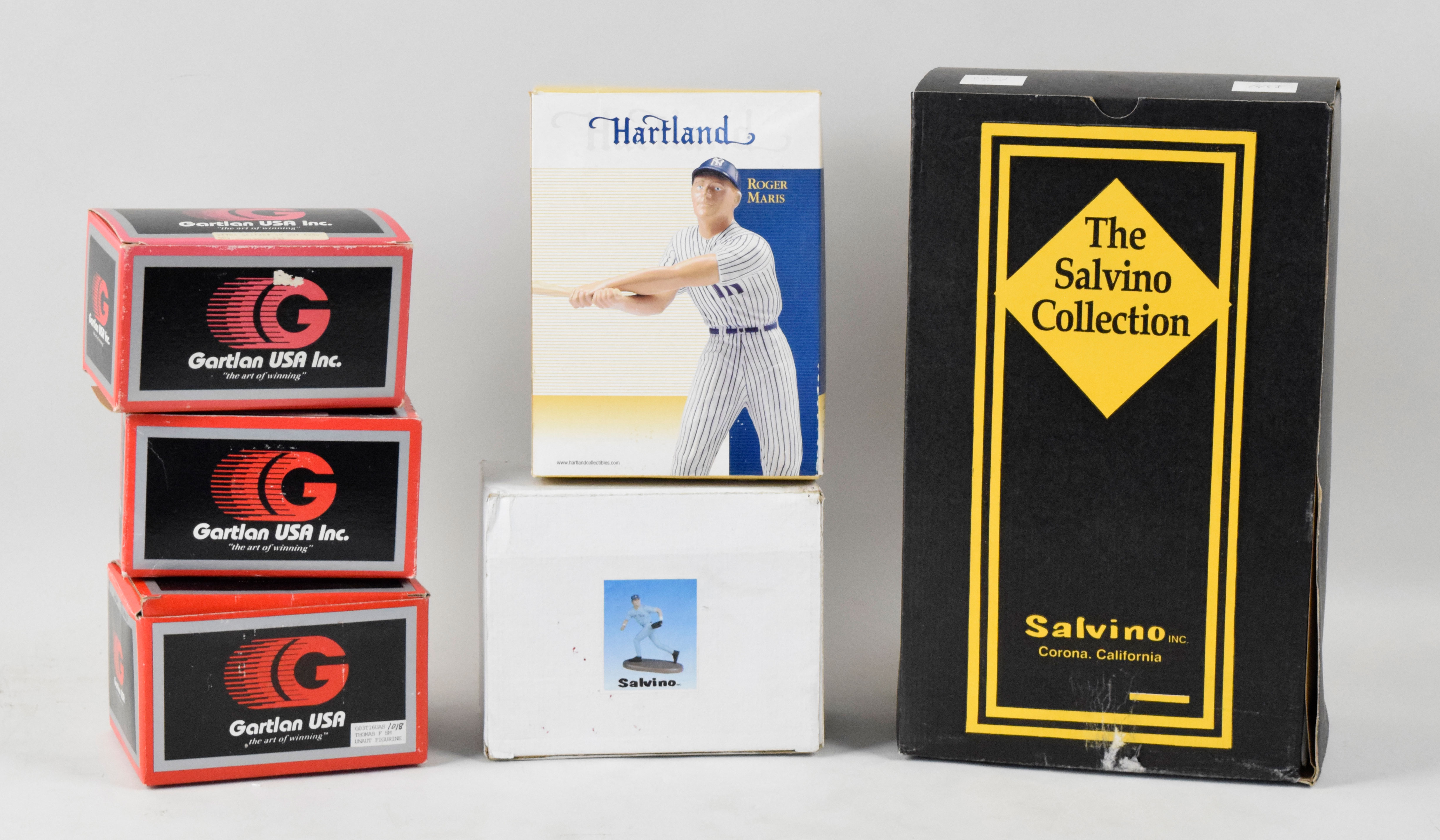 Description:Lot of (10) unsigned figurines in original boxes, including Jackie Robinson, Roberto Clemente (EX-NM). All figurines are not autographed, with remaining in its original box (with wear). Includes (3) Romito with (2) Roberto Clemente and (1) Jackie Robinson; (1) Salvino Derek Jeter large figurine (bat is broken); (1) Salvino Derek Jeter small figurine; (1) Garltan Frank Thomas mini figurine (bat broken); (2) Gartlan Wayne Greztky mini figurines (interior packaging replaced in both); (1) 2002 Hartland Roger Maris (interior packaging replaced) and (1) Sports Impressions Roberto Clemente. Figures range EX-NM and boxes range FR-EX.