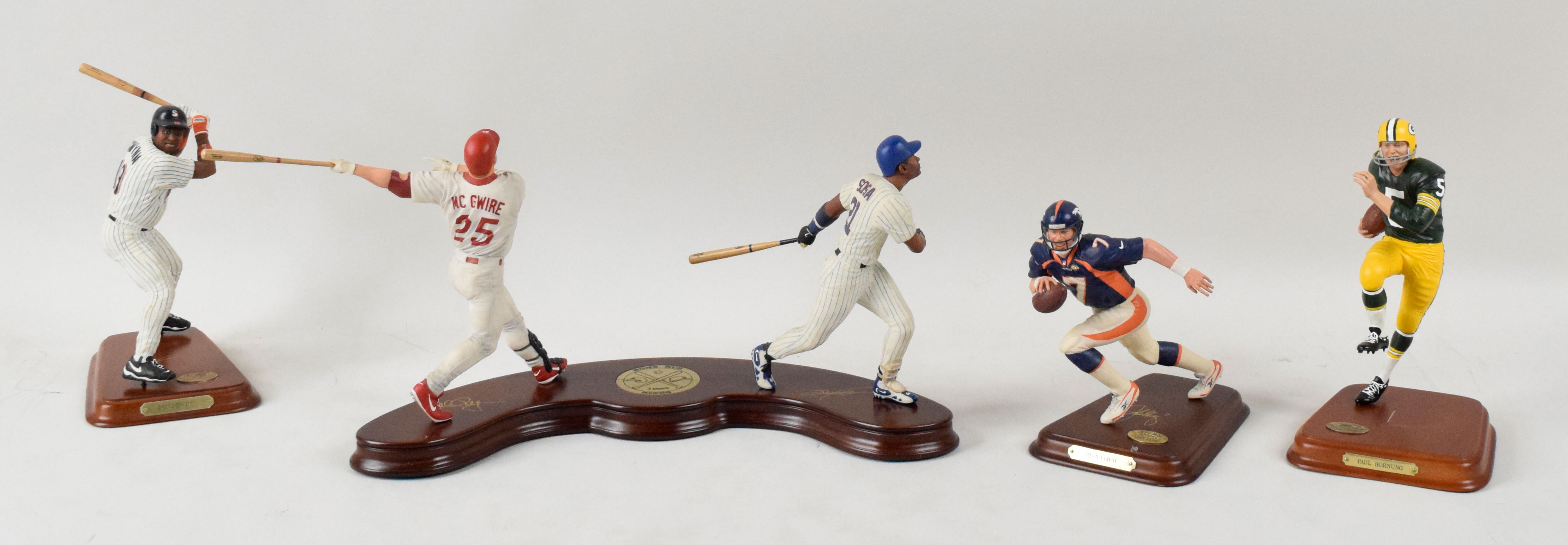 Description:Multi-sport lot of (10) Danbury Mint figurines, including Gwynn, Elway and McGwire/Sosa (EX-NM/MT). High-quality lot of Danbury Mint figurines (not in original boxes) but each with its original base and/or accessories, such as baseball bats. Includes (1) Mark McGwire/Sammy Sosa; (1) Tony Gwynn; (1) Notre Dame stadium; (1) Ray Lewis; (1) Forbes Field; (1) Troy Aikman; (1) Paul Hornung; (1) Willie Stargell; (1) Rod Carew and (1) John Elway. Figures range: EX-NM/MT.