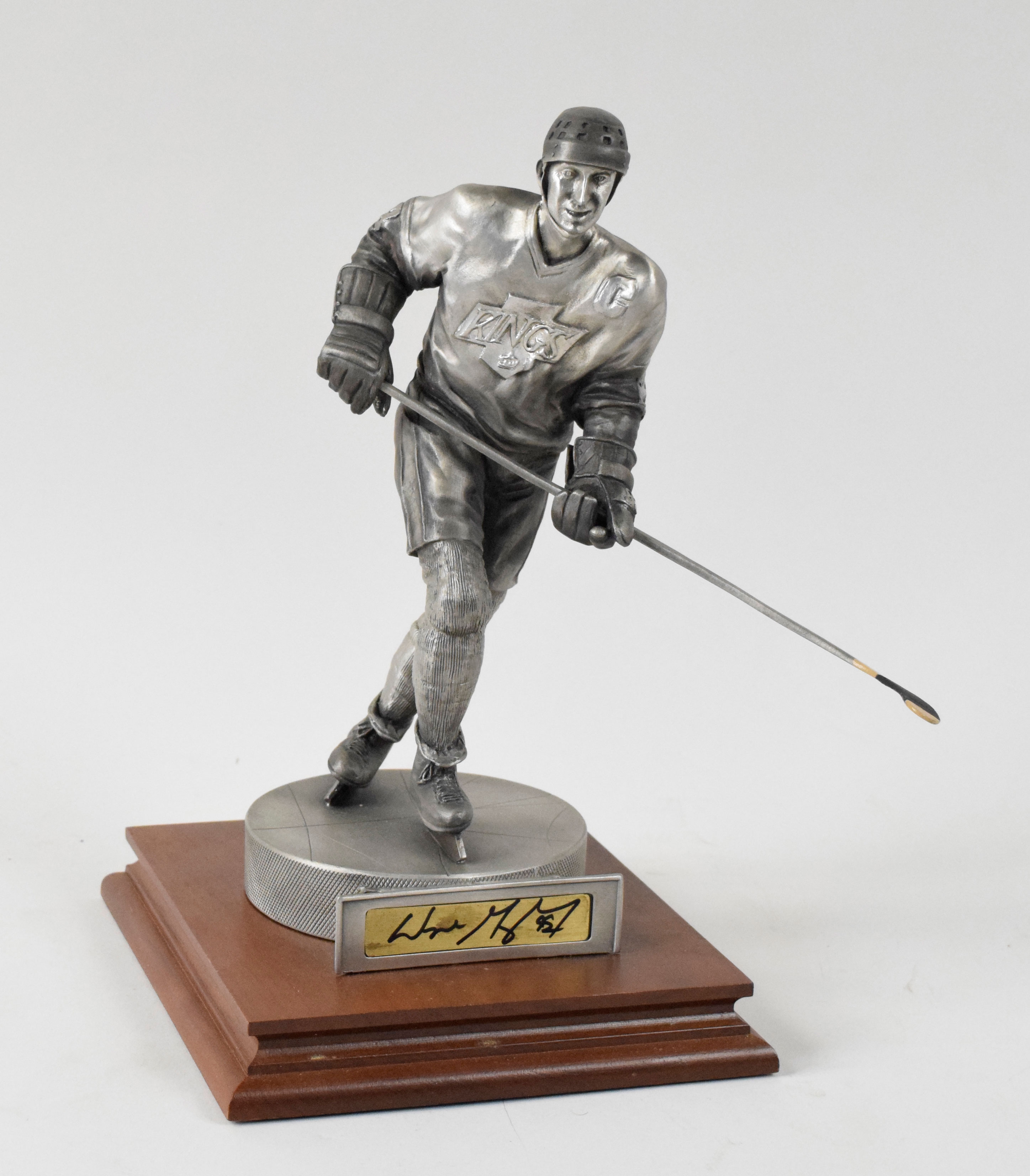 Description:1991 Gartlan Wayne Gretzky autographed pewter figurine (#498/500) (Sig. MT). Very high-quality pewter figurine of The Great One stands approx. 11" tall (with removable stick) atop a wooden base. Gretzky signed the front nameplate in black marker, rating 9 out of 10, and the piece is numbered 498/500 on the back of the base. There are a few light smudges to the nameplate not affecting the signature, and few dings to the base: EX/MT.