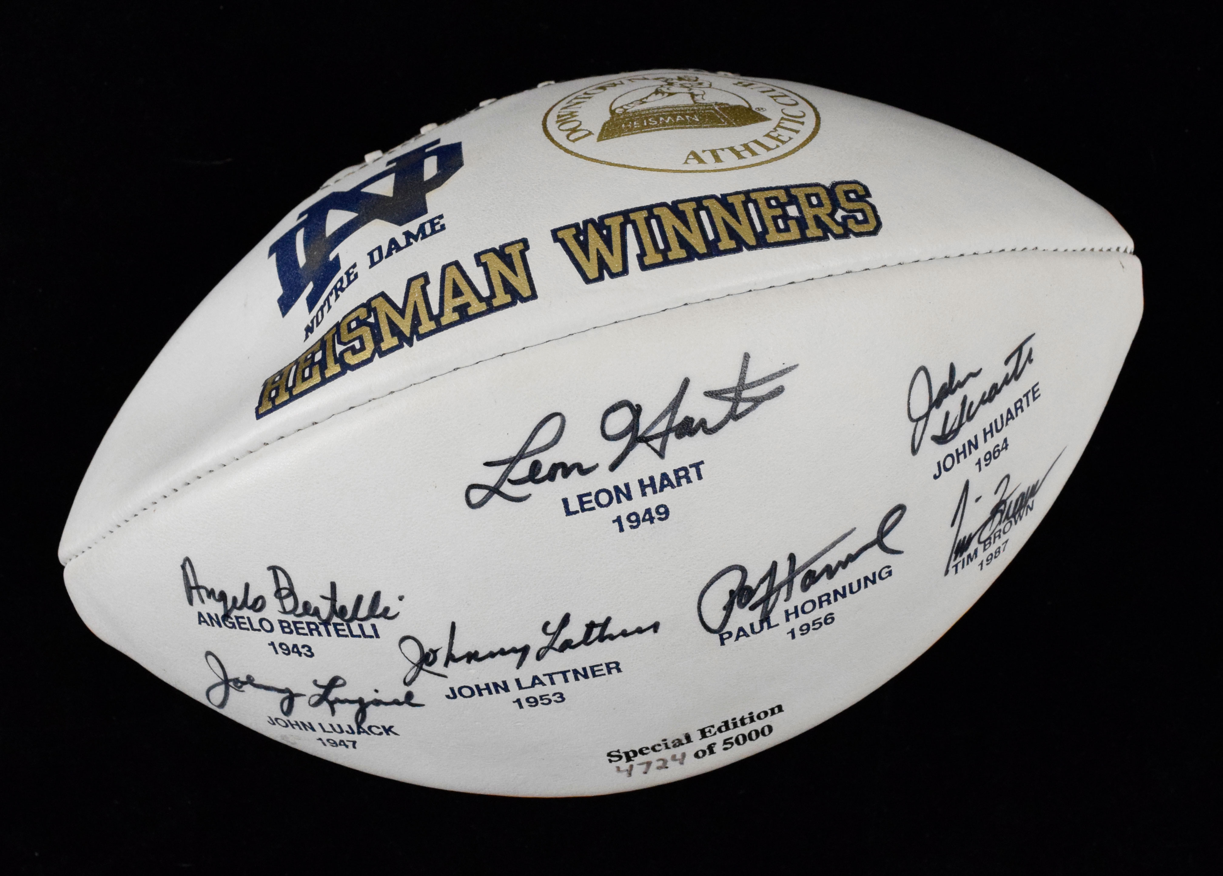 Description:Notre Dame Heisman Winners multi-signed special edition football, with Lujack, Hart and Hornung (Sigs. MT). Excellent Notre Dame Downtown Athletic Club Hiesman Winners special edition football (#d 4724/5000) has been signed in black marker by the university's seven Heisman winners: Angelo Bertelli, Leon Hart, Johnny Lujack, John Lattner, Paul Hornung, John Huarte and Tim Brown, rating 9 out of 10. Ball is mostly deflated, and it is unknown if it will hold air: VG.