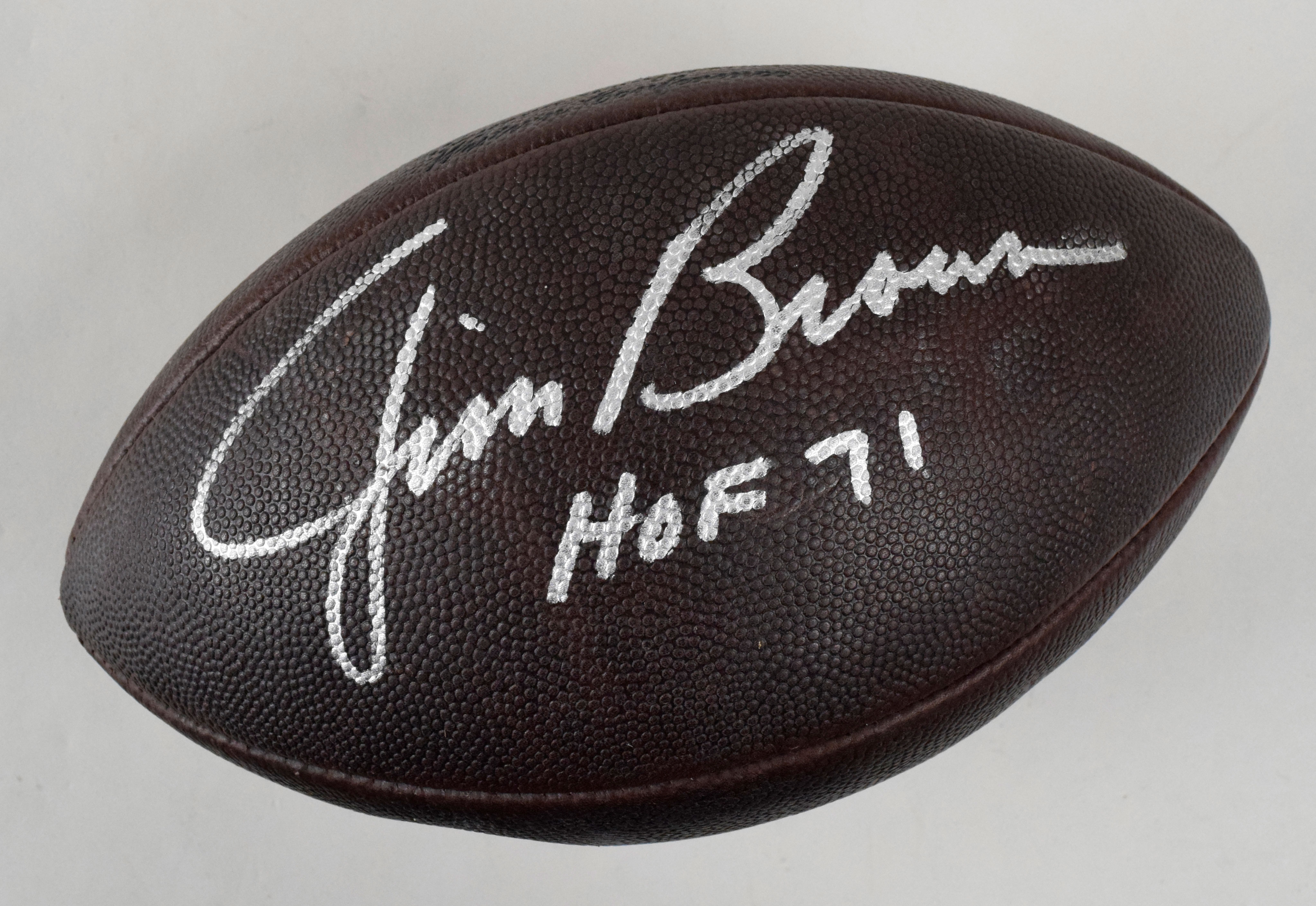 Description:Jim Brown autographed P. Rozelle throwback football with JSA authentication (Sig. MT). Outstanding Wilson P. Rozelle "Duke" throwback football has been signed by Jim Brown in silver marker, rating 9 out of 10. A JSA authentication sticker is affixed to the ball, and a basic cert is also included. Ball is partially deflated (unknown if it will hold additional air) with a light waxy coating and minor wear: EX.