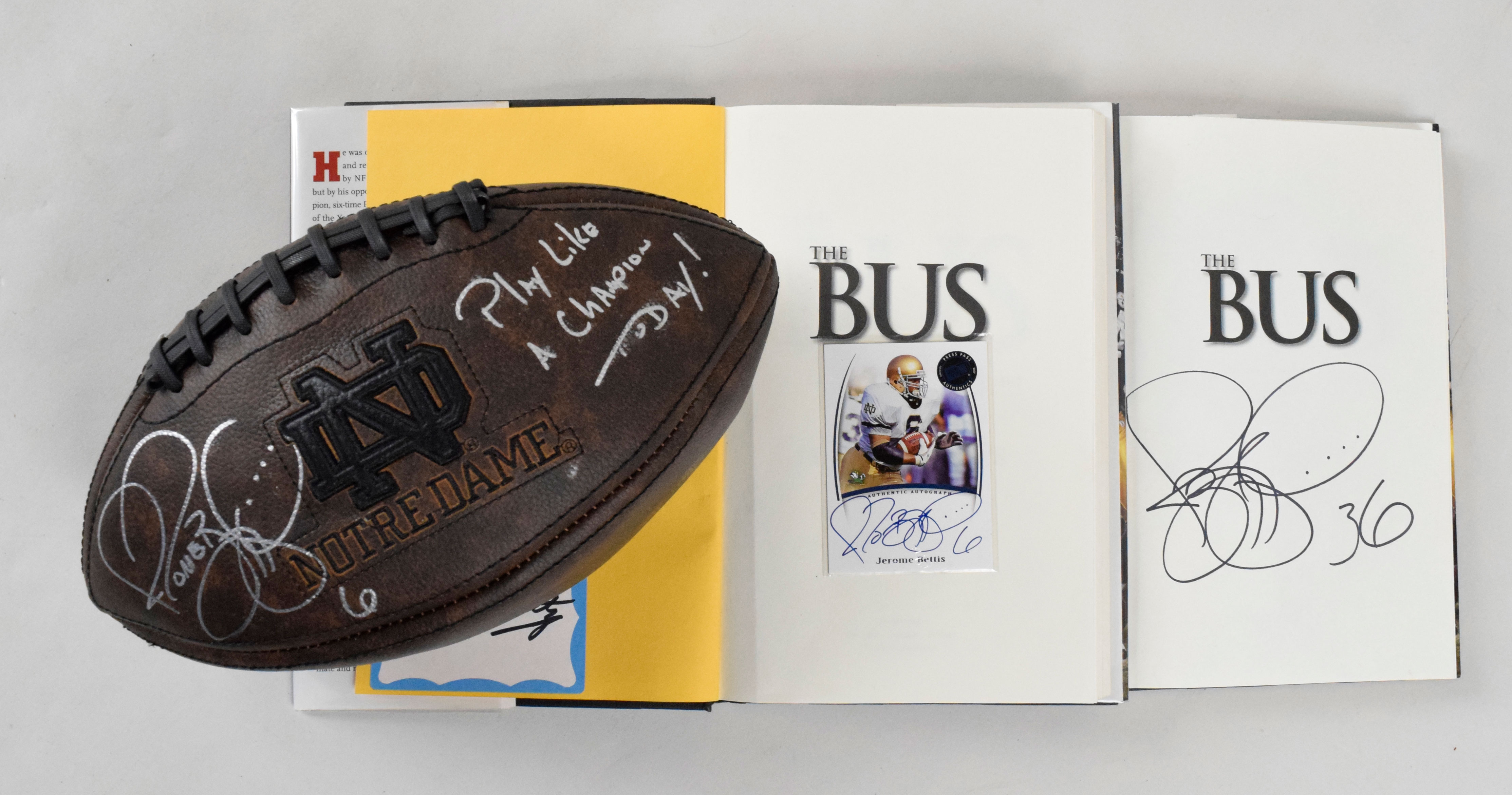 Description:Lot of (3) Jerome Bettis autographed items, including football and books (Sigs. NM/MT-MT). Includes (1) Notre Dame logo football (deflated) signed in silver marker by Bettis with "Play Like A Champion Today!" inscription and (2) hardcover books "My Life in And Out of a Helmet; The Bus," with one signed on a inner page in black marker by Bettis and (1) with a Bettis-autographed Press Pass card (not affixed) on title page and sticker also autographed by Lou Holtz affixed to inner page. Signatures rate 8/9 out of 10, and football/books range: VG-NM.
