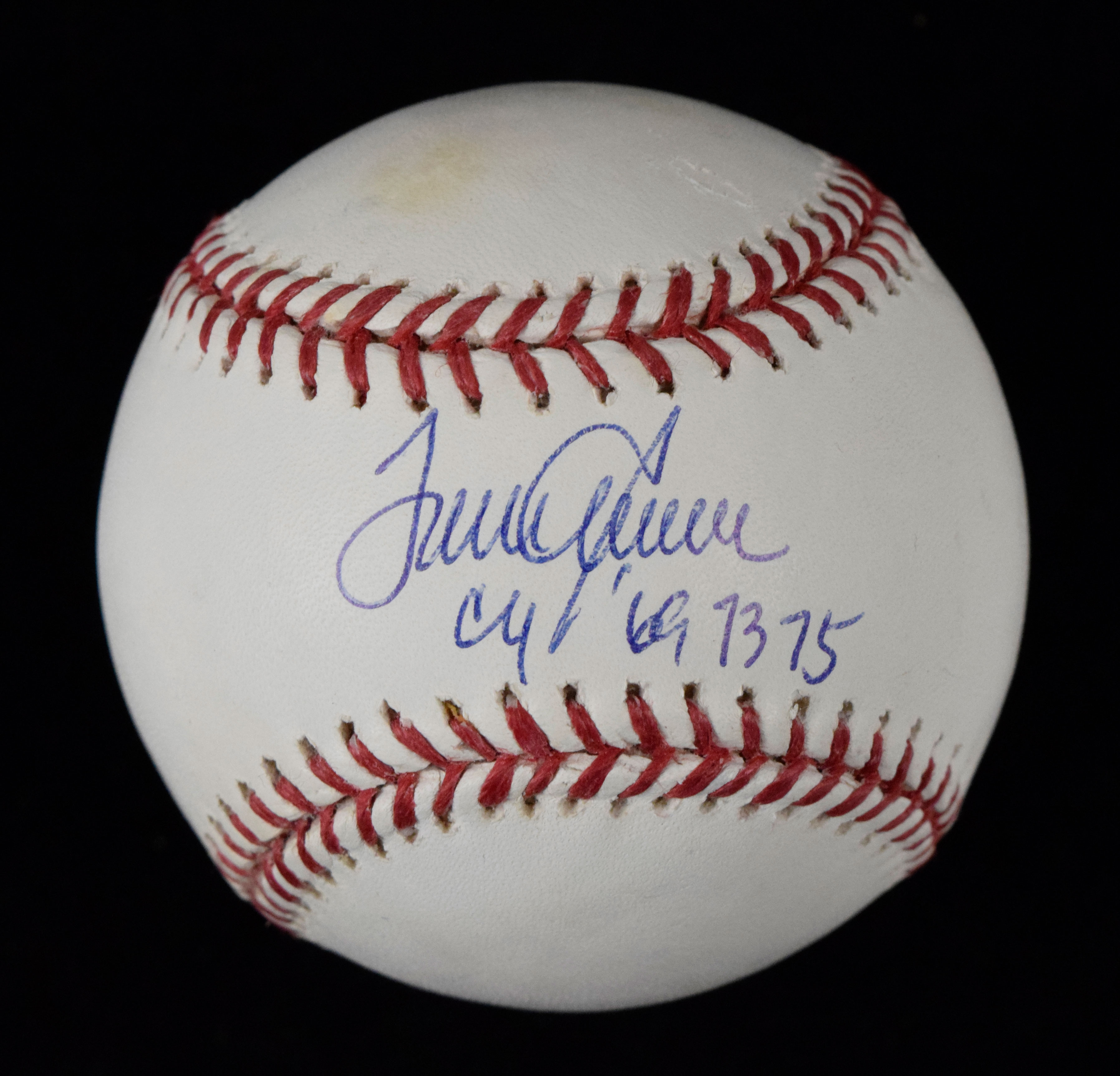 Description:Tom Seaver autographed B. Selig baseball with (3) Cy Young inscriptions and PSA/DNA authentication (Sig. MT). Outstanding B. Selig MLB baseball has been signed on the sweet spot in blue ink by Tom Seaver with "Cy '69, 73, 75" inscriptions, rating 9 out of 10. A PSA/DNA authentication sticker is affixed to the ball, which has a couple light spots of toning: EX/MT.