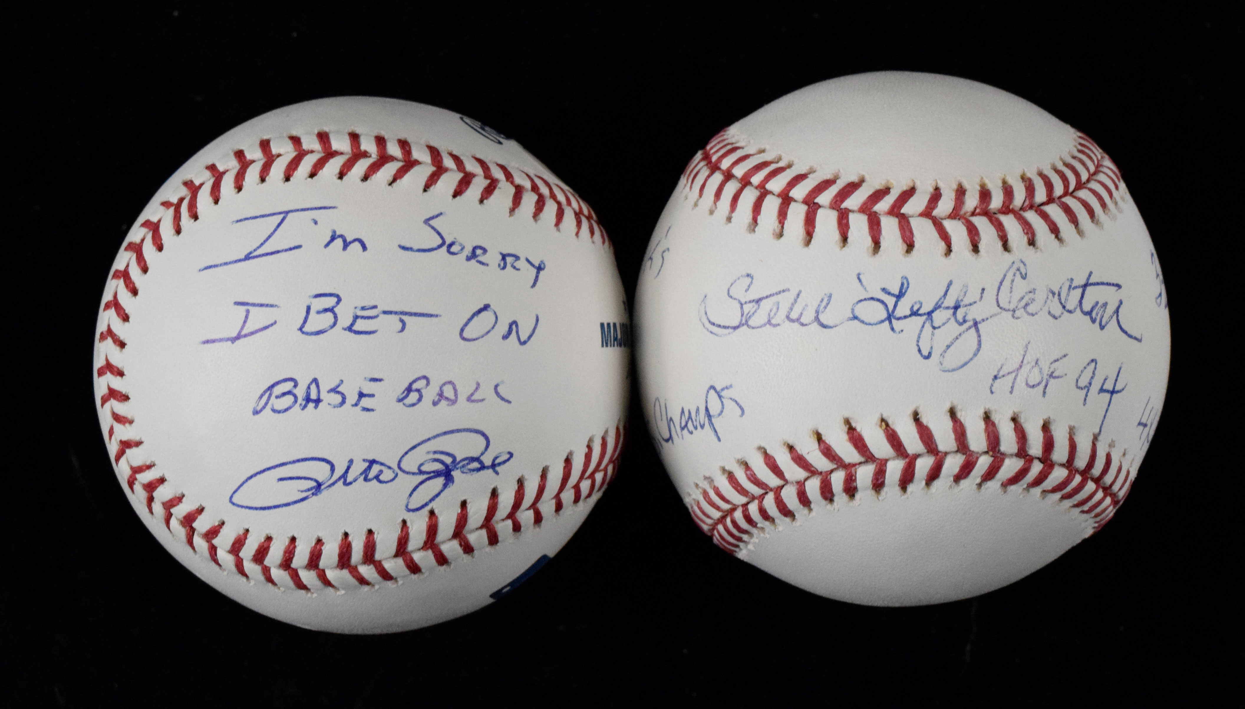 Description:Lot of (2) signed & inscribed baseballs, with Rose "I'm sorry I bet" & Carlton stats, PSA/DNA auth (Sigs. NM/MT-GEM MT). Outstanding lot of (2) B. Selig MLB baseballs, each of which is affixed with a PSA/DNA authentication sticker. Includes (1) signed on the side panel by Pete Rose with "I'm Sorry I bet on Baseball" inscription (also with PSA/DNA basic cert grading the autograph a 10 and baseball a 9); and (1) signed Steve "Lefty" Carlton with "329 W's, 4x N.L. Cy Young, 2x W.S. Champs, 4136 K's and HOF 94" inscriptions on the various panels, rating 8 out of 10. Balls have little to no toning/wear: NM/MT. Sig. range: NM/MT-GEM MT (PSA/DNA).