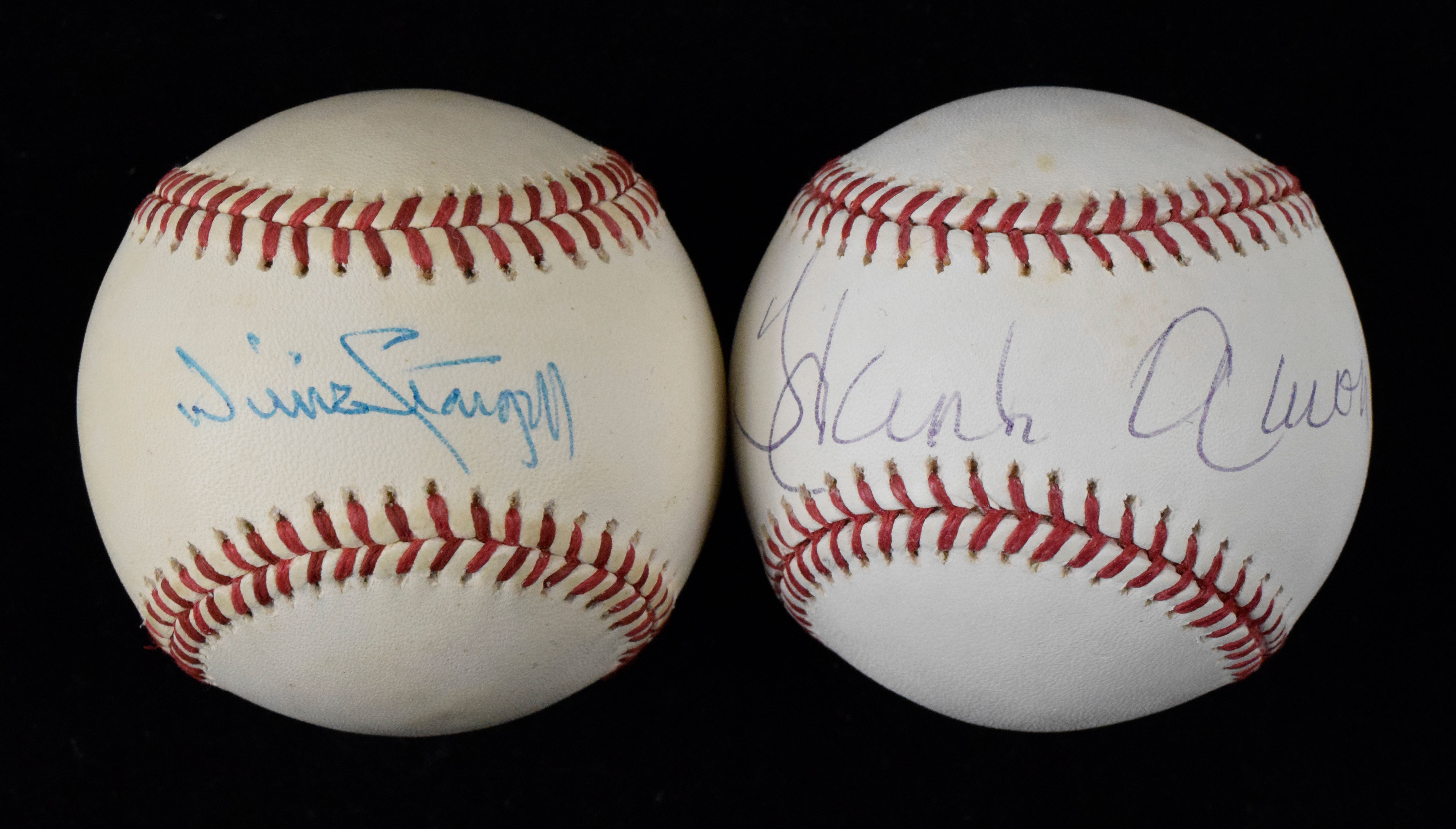 Description:Lot of (2) autographed baseballs with PSA/DNA auth., including Hank Aaron & Willie Stargell (Sigs. NM-NM/MT). High-value lot of single signed baseballs, each of which has a PSA/DNA authentication sticker affixed. Includes (1) B. Selig MLB signed by Hank Aaron, rating 7 out of 10 and (1) W. White N.L. ball signed by Willie Stargell, rating 8 out of 10. Balls have light to moderate toning: EX-EX/MT.