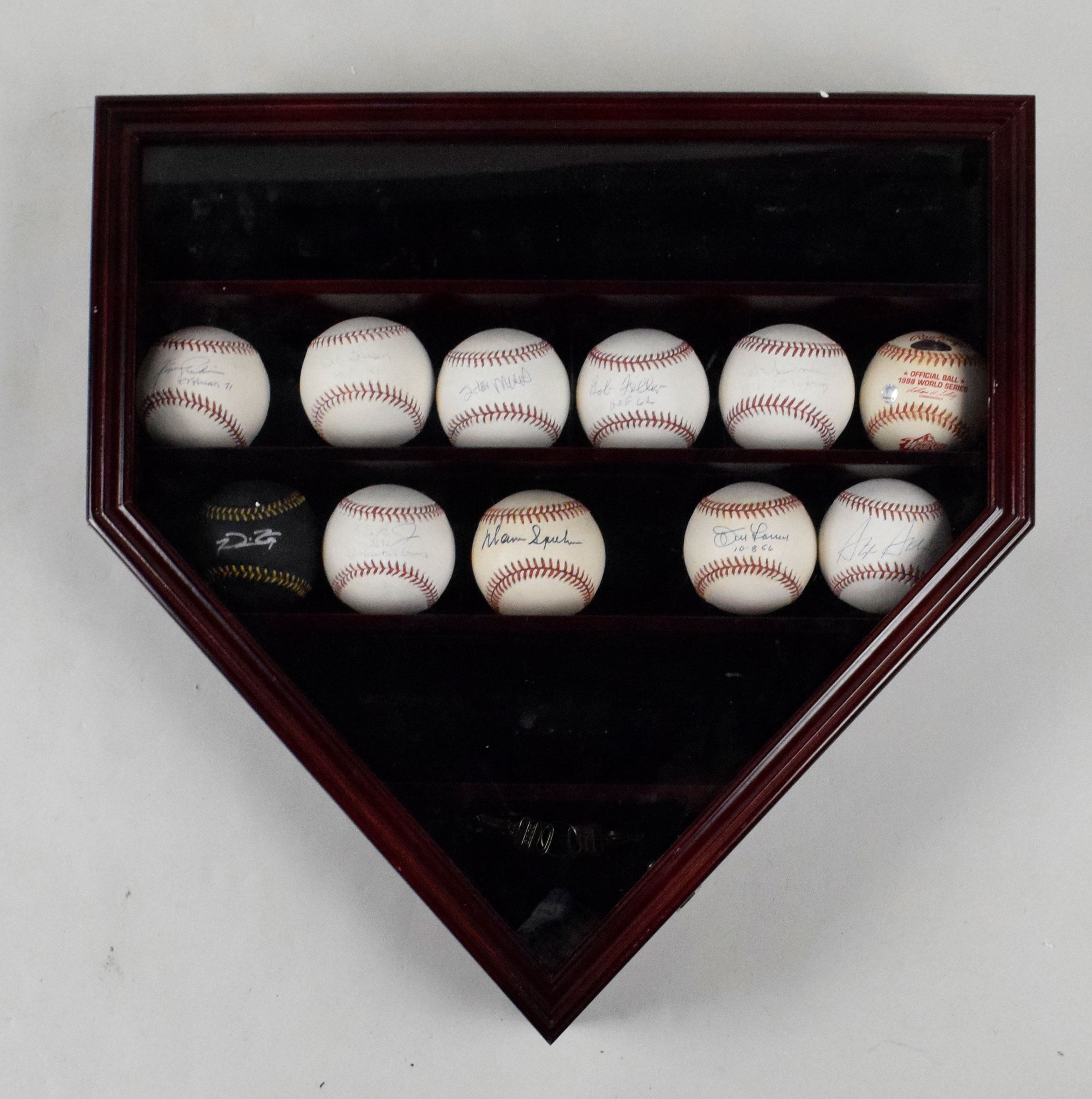 Description:Lot of (10) autographed baseballs with HOFers & JSA, PSA/DNA in home plate display case (Sigs. VG/EX-MT). High-value lot of single-signed baseballs is housed in an attractive wooden 19"x21"x4" wooden home plate-shaped display case (with key included). Includes (6) balls with PSA/DNA authentication stickers affixed, all on B. Selig MLB balls: Stan Musial, Bob Feller with "HOF 62" inscription, Bob Gibson with "HOF 81" inscription (signature faded, rating 4 out of 10), Fergie Jenkins with "Cy Young 71" inscription; Stephen Strasburg, and Don Newcombe with "1956 1st Cy Young" inscription (signature faded, rating 4 out of 10); (3) with JSA authentication stickers affixed: Cal Ripken Jr. on B. Selig MLB ball with "2632 consecutive games" inscription (Signature faded, rating 5 out of 10), Don Larsen on G. Budig A.L. ball with "10-8-56" inscription and Warren Spahn on F. Vincent 1990 All-Star Game ball; and (1) with Steiner authentication sticker affixed: Prince Fielder on B. Selig MLB ball. Also included (not included in autographed ball count) is a B. Selig 1998 World Series ball with MLB and Steiner authentication stickers formerly signed by Derek Jeter, but the signature has faded to the point of oblivion, rating 0 out of 10. Signatures range from 4/5 (noted above) to 9 out of 10, and balls have light to moderate toning: VG/EX-NM/MT. Case: EX/MT.