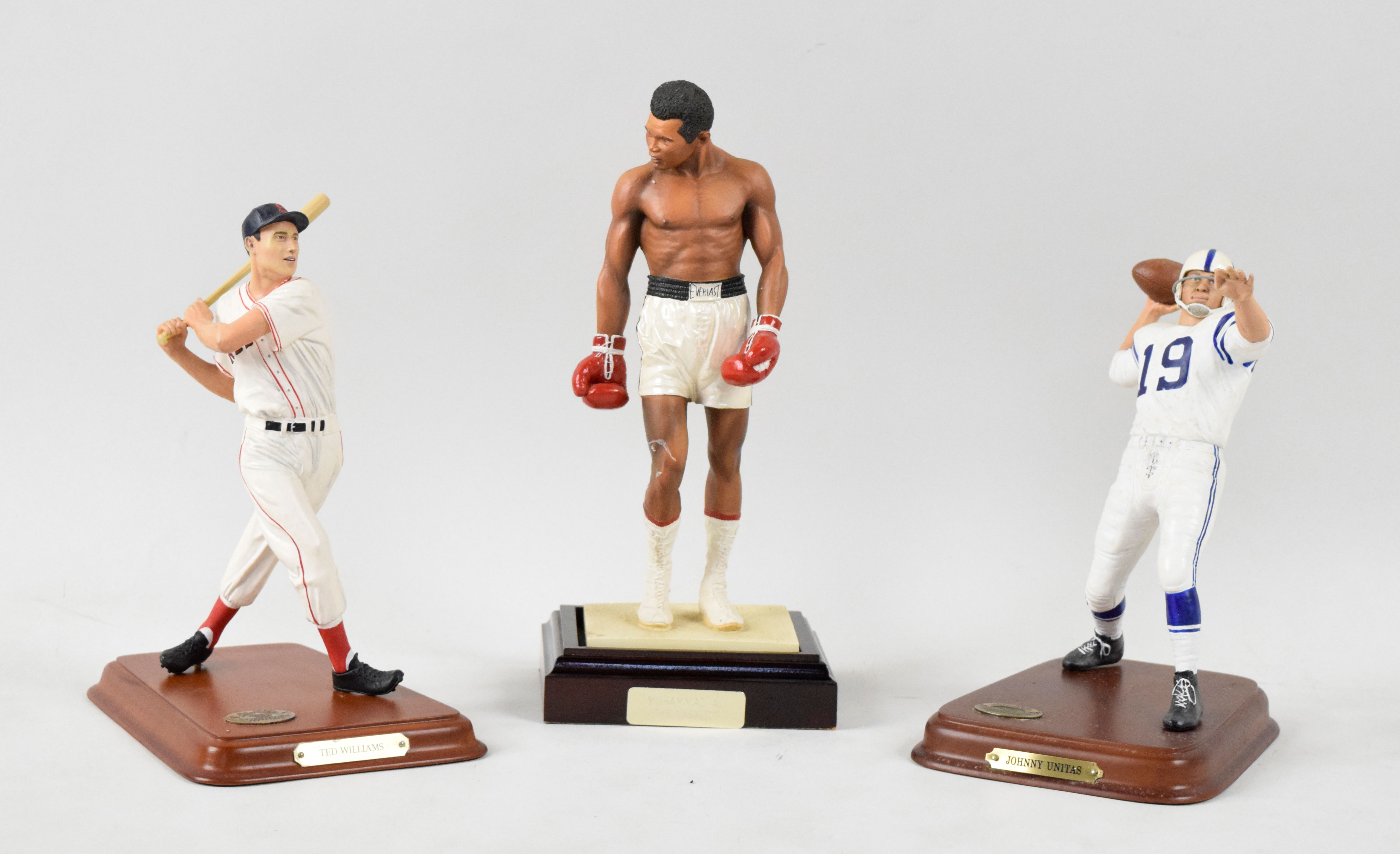 Description:Multi-sport lot of (10) Danbury Mint figurines, including Unitas, Ali and Williams (VG/EX-NM/MT). High-quality lot of Danbury Mint figurines (not in original boxes) but each with its original base and/or accessories, such as baseball bats. Includes (1) Ted Williams; (1) Jim Kelly; (1) Muhammad Ali; (1) Johnny Unitas; (1) Johnny Bench; (1) Charles Woodson; (1) Terrell Davis; (1) Joe DiMaggio (bat broken off at handle); (1) Carl Yastrzemski and (1) Magic Johnson. Figures range: VG/EX-NM/MT.