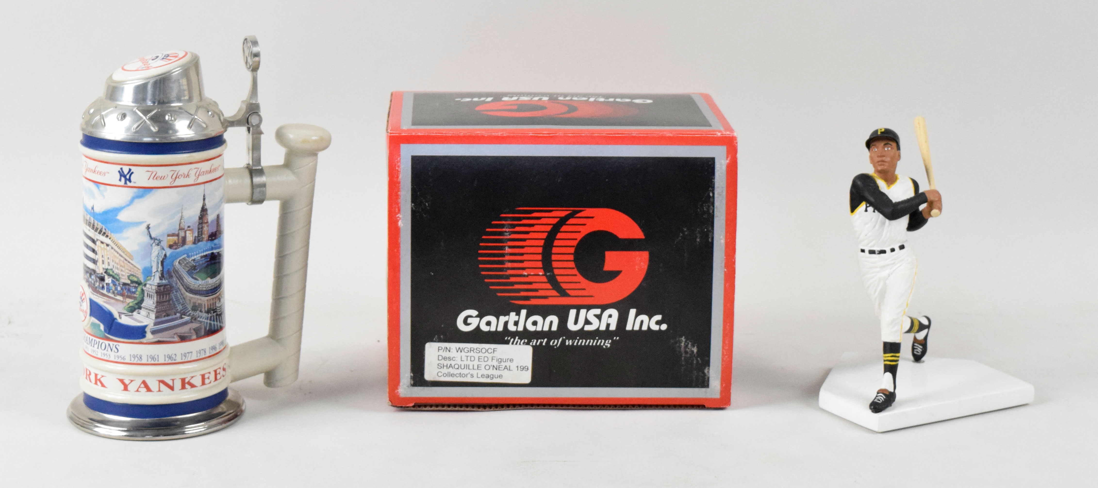 Description:Multi-sport lot of (9) unsigned figurines and steins, including Gartlan and Salvino (EX- NM/MT). High-quality lot of limited edition unsigned figurines (not in original boxes unless noted). None are aut. Includes (1) Danbury Mint New York Yankees stein; (1) Danbury Mint Pittsburgh Steelers stein; (1) Gartlan Shaquille O'Neal in original box; (1) Salvino Billy Martin; (1) Salvino Mario Lemieux; (3) Salvino Roberto Clemente; and (1) Salvino Shaquille O'Neal. Figurines/steins range EX-NM/MT-