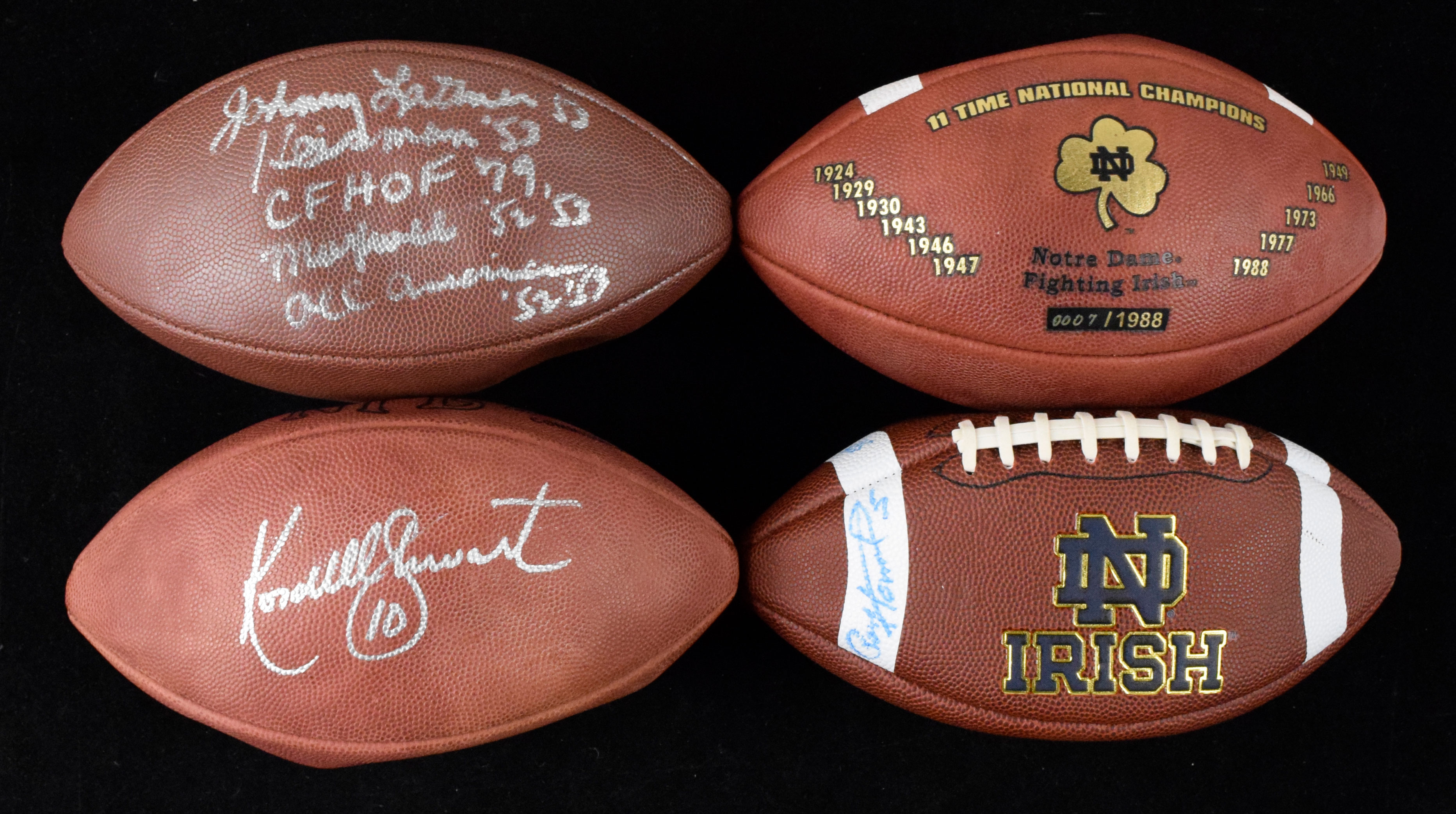 Description:Lot of (9) footballs, including commemorative and (3) autographed, including Paul Hornung (Sigs. NM). Lot includes (3) autographed footballs, with (1) P. Tagliabue ball signed by Kordell Stewart; (1) Wilson NFL logo ball signed by Johnny Lattner with (4) career-related inscriptions and (1) Rawlings Notre Dame logo ball signed by Paul Hornung. Also included are (2) Notre Dame Stadium souvenir balls and (3) various Notre Dame commemorative logo balls (one completely deflated) and (1) Wilson Notre Dame 11 Time National Champions commemorative all #d 7/1988. Autographs rate 7 out of 10, and balls range EX-NM but all are either partially or completely deflated. It is unknown if any will hold additional air.