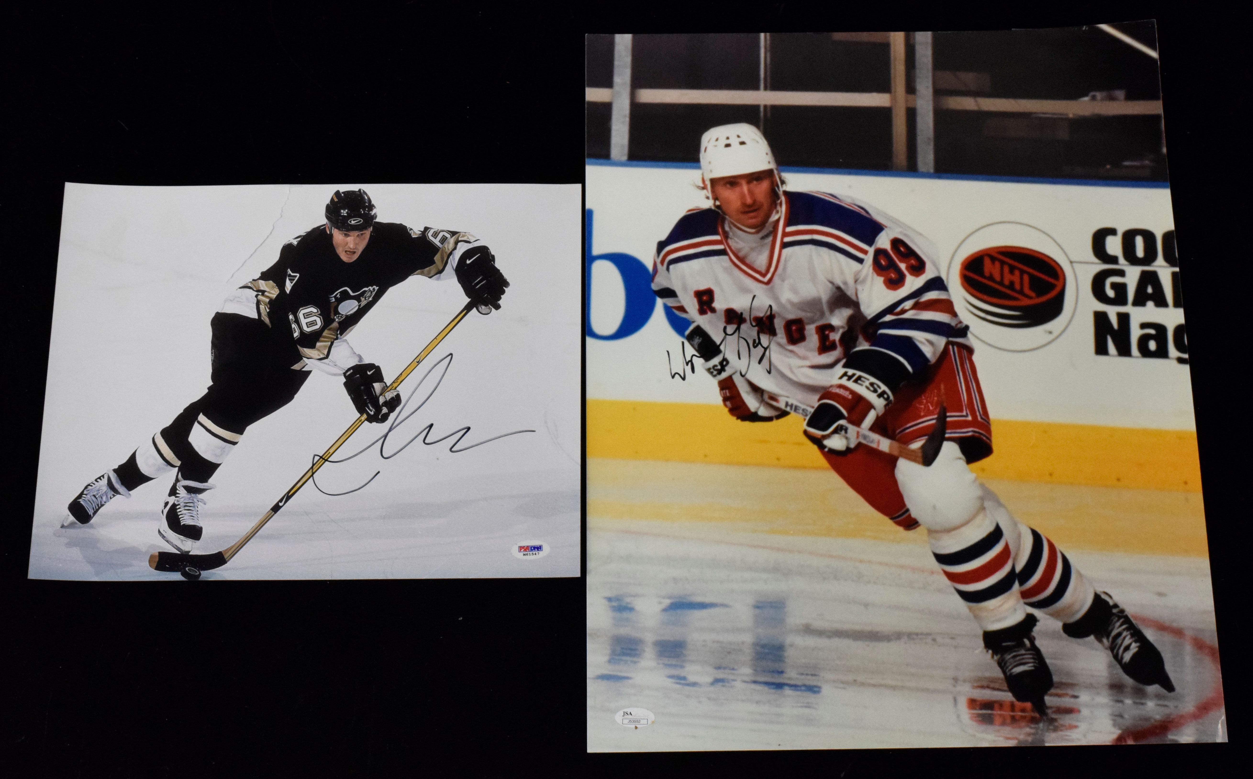 Description:Lot of (2) hockey autographed photos with Gretzky & Lemieux & JSA, PSA/DNA (Sigs. NM-NM/MT; see. desc.) Nice lot autographed by two hockey icons, with (1) 16"x20" photo of Wayne Gretzky signed by Gretzky in black marker, rating 8 out of 10 with JSA authentication sticker affixed to the lower left and (1) 11"x14" photo of Mario Lemieux (NOTE: Photo has approx. 4" tear above Lemieux's shoulder, with signature rating 7 out of 10 and PSA/DNA authentication sticker and basic cert. Signatures range 7/8 and photos range PR (Lemieux) - VG/EX.