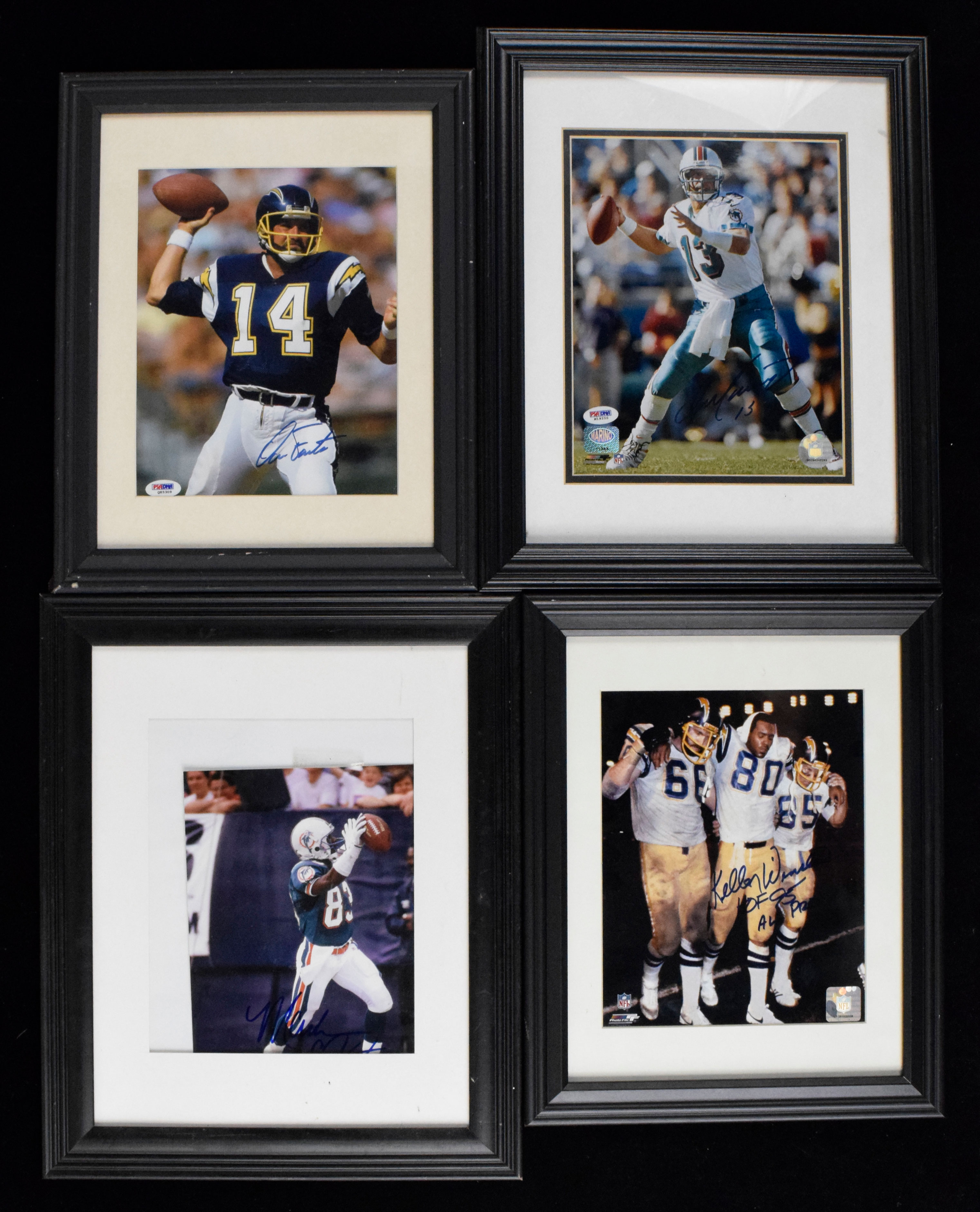 Description:Lot of (5) small framed and autographed FB photos, including Marino, Fouts and Winslow (Sigs. NM/MT-MT). Each is framed and matted to approx. 14"x17" or smaller. Includes (1) signed by Dan Marino with PSA/DNA authentication sticker; (1) signed by Dan Fouts with PSA/DNA authentication sticker; (1) signed by Kellen Winslow with "HOF 95 All Pro" inscriptions; (1) signed by Mark Duper; (1) signed by Mark Clayton. Signatures rate 8/9 out of 10 and frames appear EX-EX/MT.