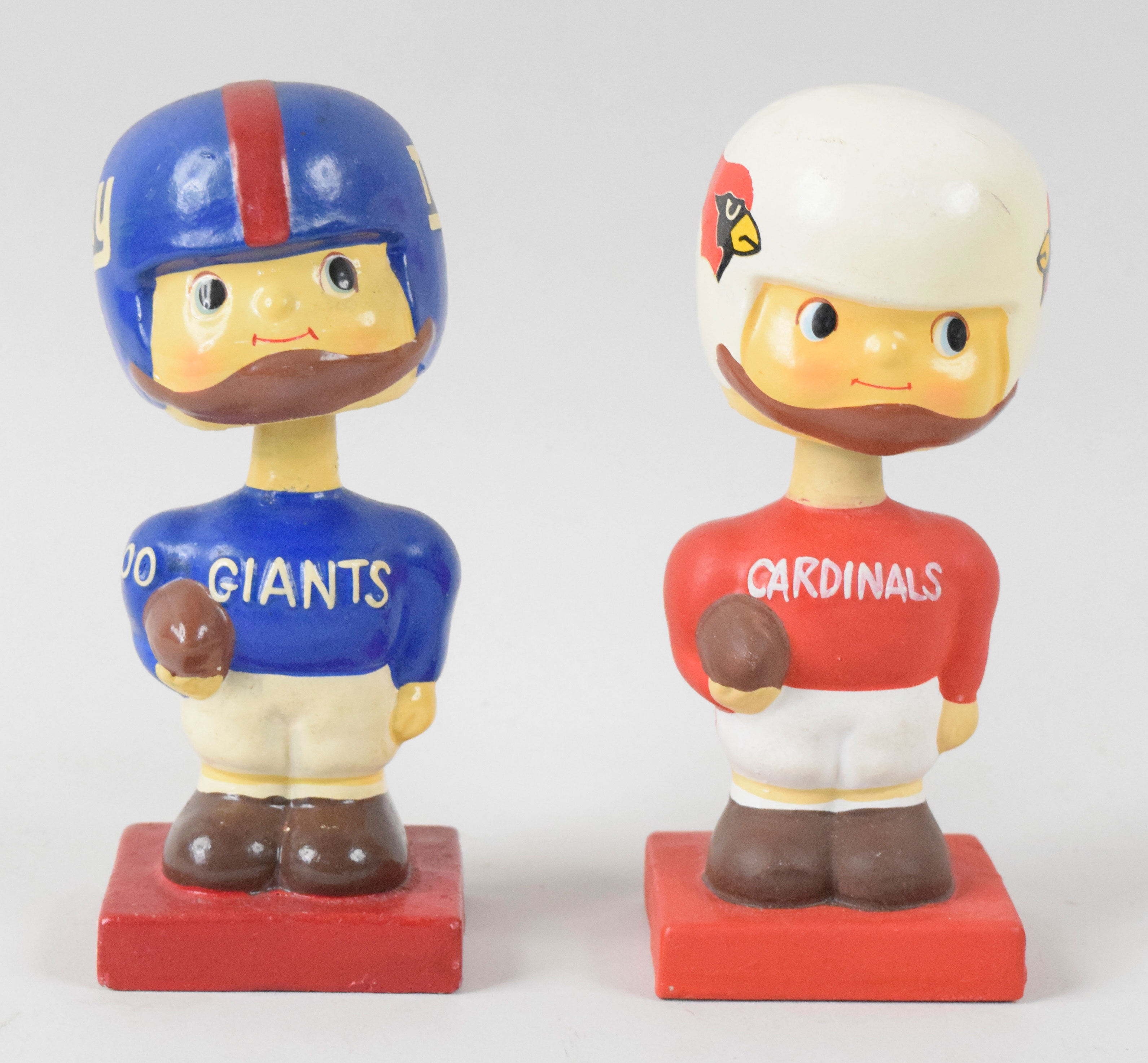 Description:New York Giants and St. Louis Cardinals vintage nodders, c.1960-63 (VG/EX-EX/MT). Both are square base nodders. Giants grades EX-EX/MT, and Cardinals grades VG/EX due to some helmet indentations.