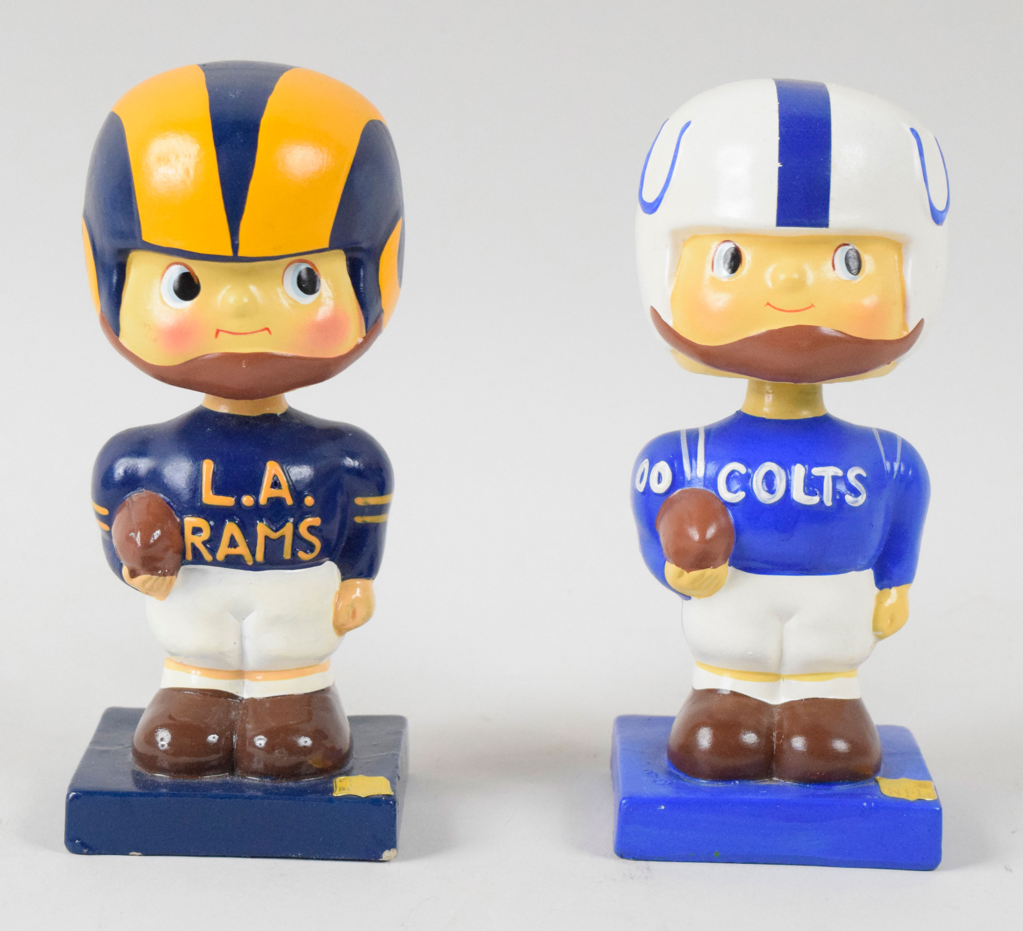 Description:Baltimore Colts and Los Angeles Rams vintage nodders, c.1960-63 (EX/MT). Both are square base nodders. Colts grades EX/MT, and Rams also grades EX/MT but the NFL logo decal was placed on backwards: EX/MT