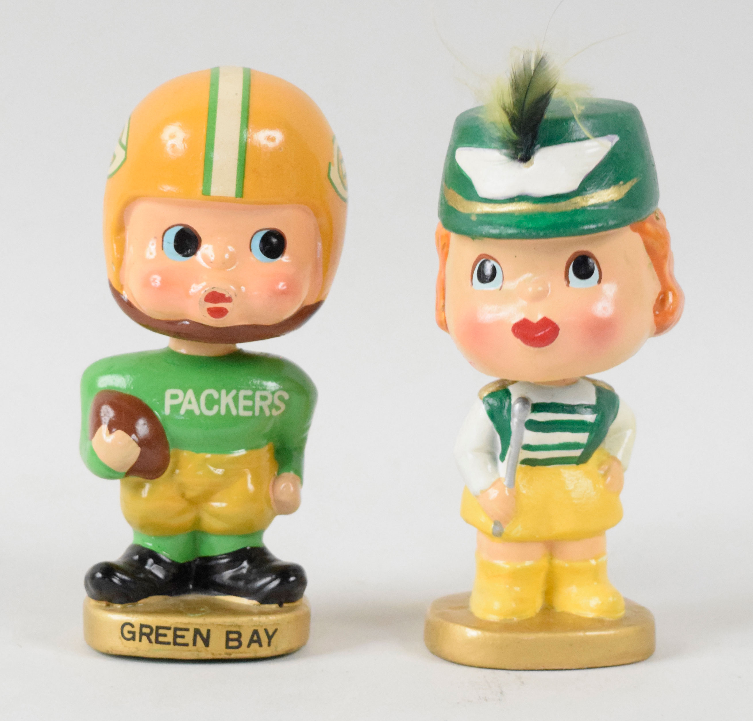Description:Green Bay Packers kissing nodders pair, c.1962-64 (EX-NM). Packers player nodder grades EX due to chipped helmet decals. The majorette nodder grades EX/MT-NM.