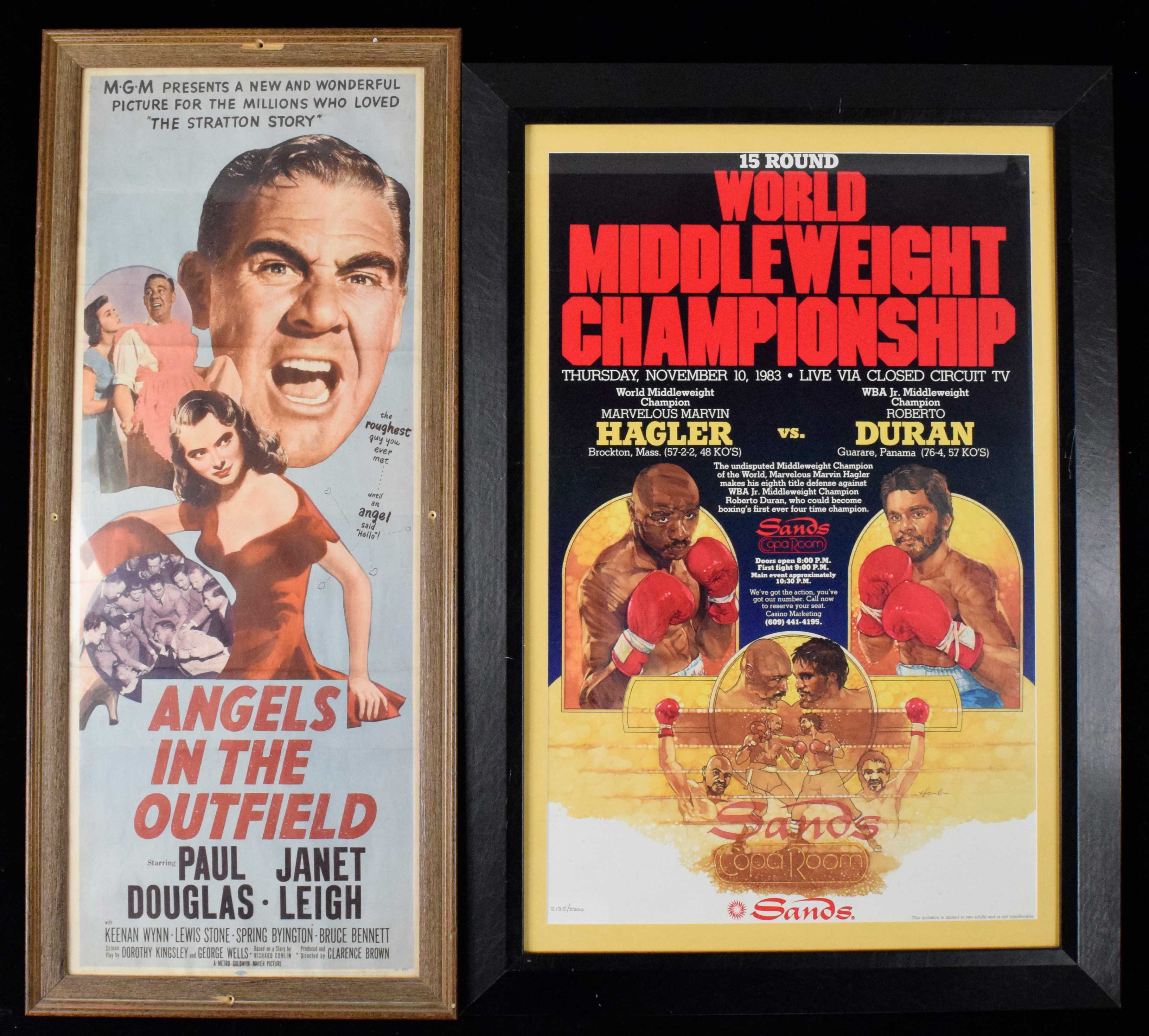 Description:Lot of (2) vintage movie posters plus 1983 Hagler vs. Duran boxing poster (VG-NM framed). Includes 16.5"x38.5" framed 1951 "Angels In The Outfield" movie poster (VG fold creases visible), 25"x31" framed 1952 "No Holds Barred" movie poster (EX/MT appearance), and 26"x37" framed 1983 Marvin Hagler vs Roberto Duran poster #ed 2135/2200 (NM appearance).