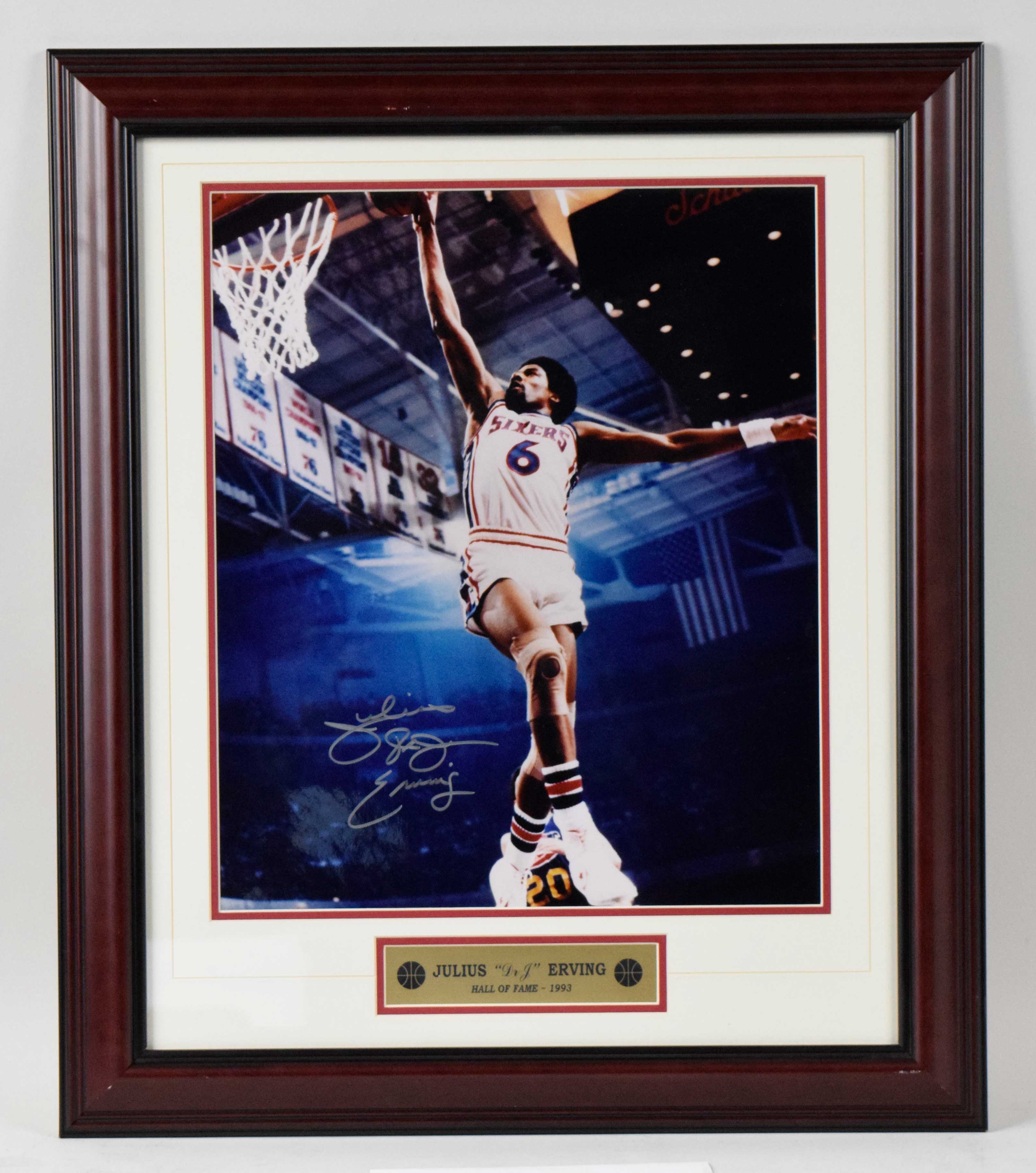 Description:Julius "Dr. J" Erving signed oversize framed photograph (NM). Frame measures approx. 24"x28". Erving signed the photo in silver marker. Signature rates 9 out of 10. Due to framing, complete condition is unknown: NM appearance